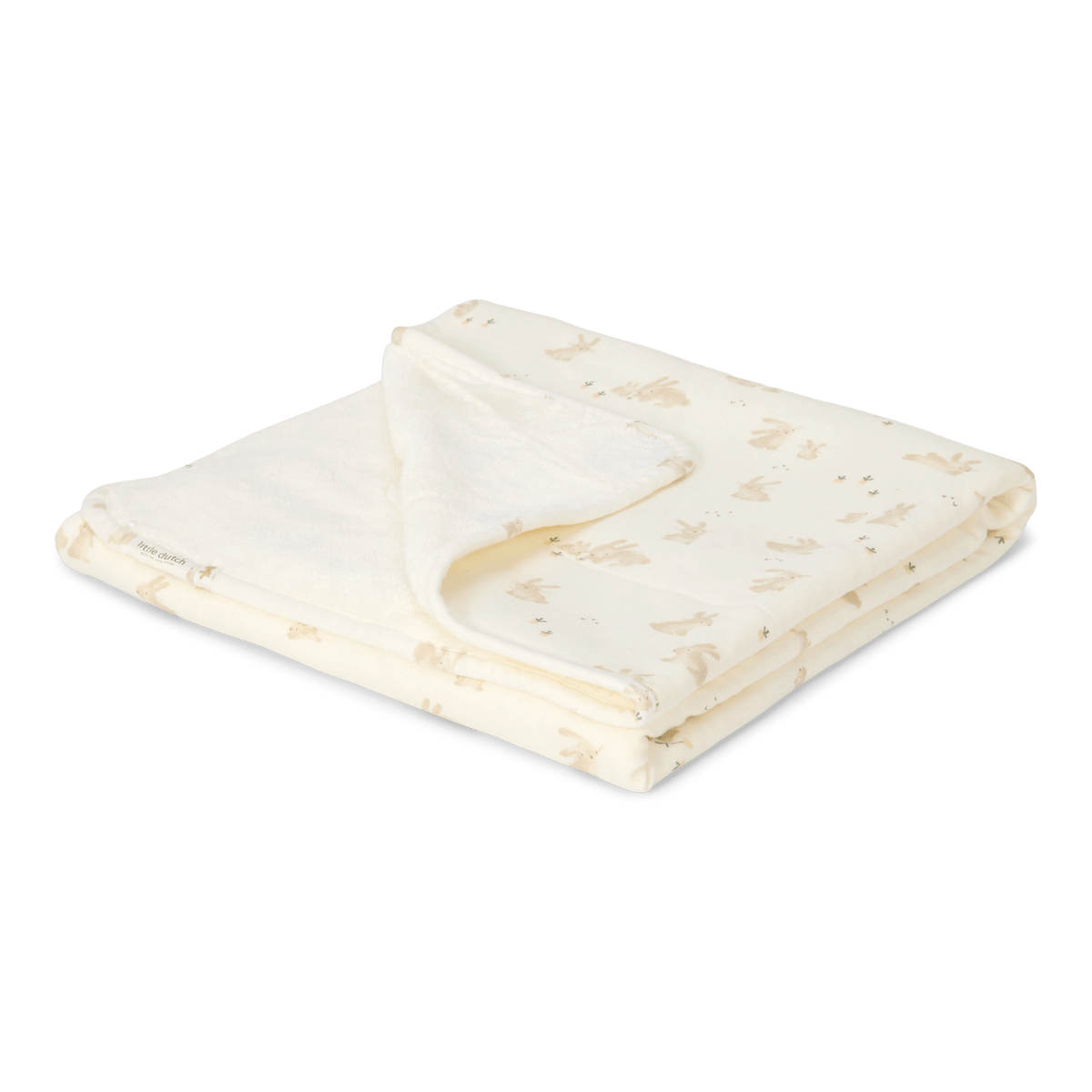 A beautiful crib blanket that keeps your little one wonderfully warm. With soft jersey on one side and the cozy fleece on the other, this blanket is versatile: use it as a shawl, bedspread or even as a play rug. Decorated with cute bunnies, this copy from the Baby Bunny collection combines the best of nostalgia with a fresh, modern touch. It is made of 100% organic cotton and has a generous TOG value of 2.5, perfect for cold nights. And handy: you can just wash it in the washing machine at 30 degrees!