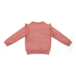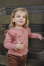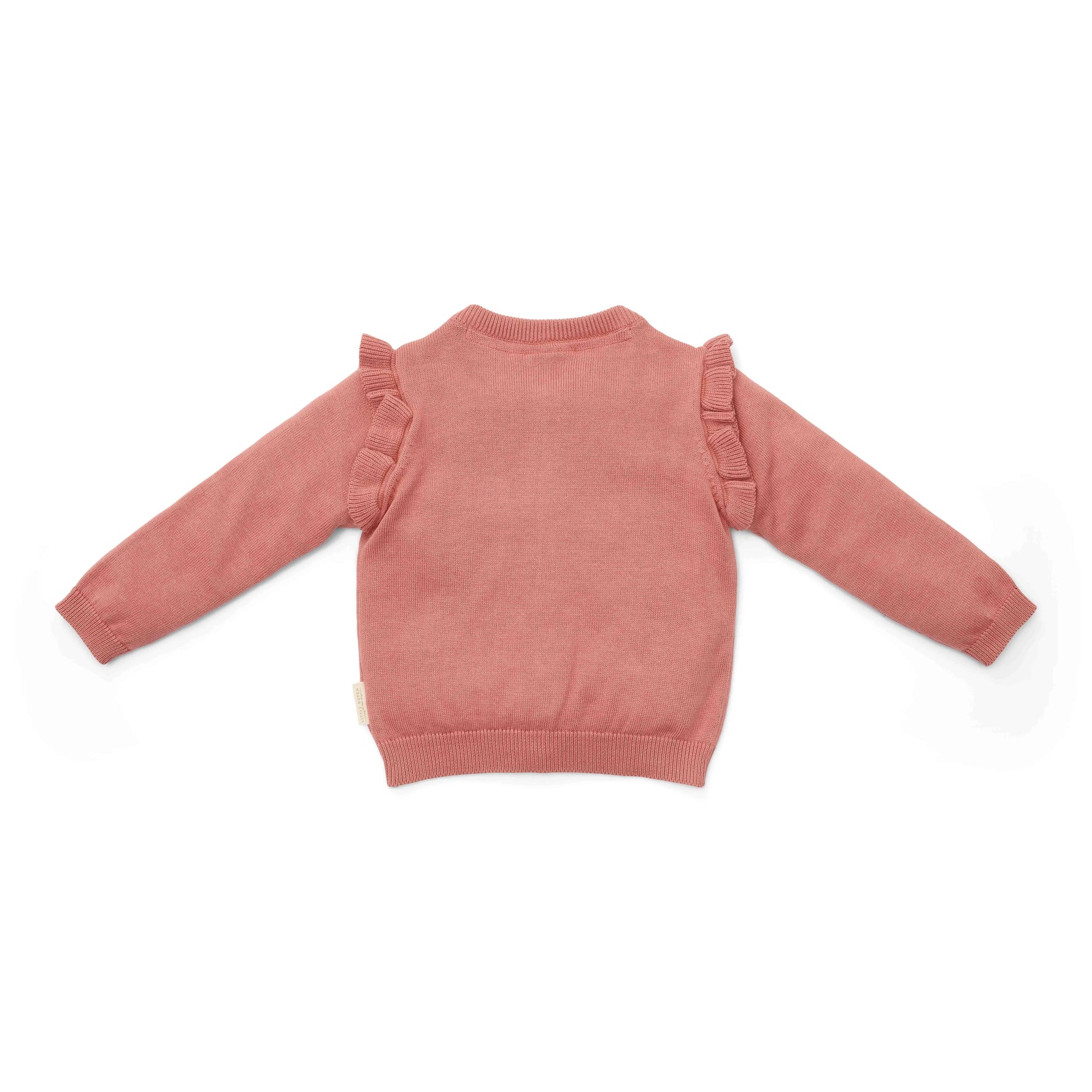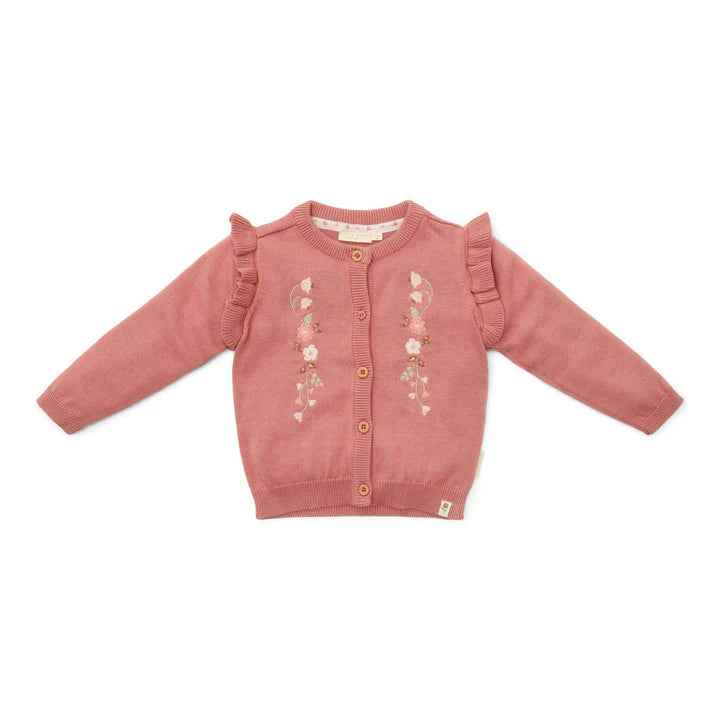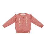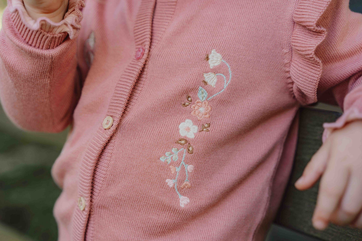 This cute knitted cardigan will take you to the floral meadows of the countryside. The warm pink colour is decorated with large floral embroidery on the chest and ruffles on the shoulders. Features wood-look buttons, including an eye-catching flower-shaped button. Made from soft organic cotton, this comfortable cardigan is perfect as an extra layer of warmth on colder days. It pairs beautifully with the other items from the coordinated Farm collection.
