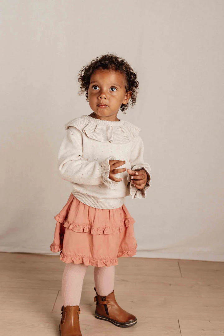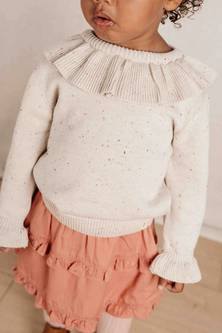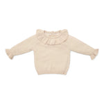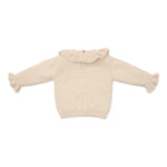 Stay warm and stylish with this pretty knitted jumper in a beautiful sand colour. Made from soft, organic cotton, this jumper ensures both comfort and style. The ruffle around the neckline and elasticated sleeve ends add a playful twist. Mix and match with skirts, trousers or shorts from the coordinated Farm collection. Available in sizes 74, 80, 86, 92, 98 and 104.