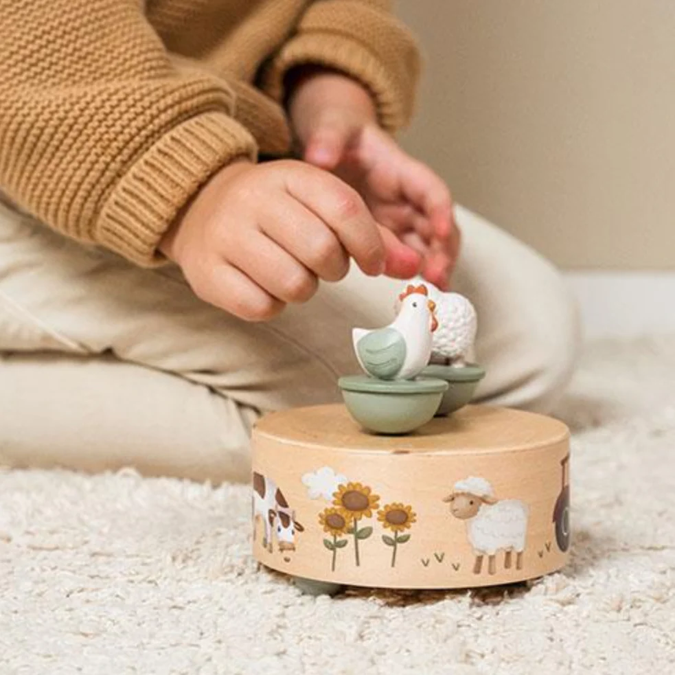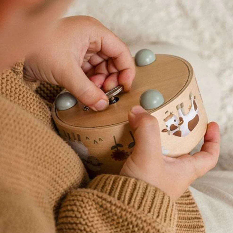 Watch the chicken and sheep spin, while music plays! This round shaped music box is decorated with a cheerful scene of the beloved Little Farm. Gently wind at the bottom and set the magical dance in motion. As the melody begins to play, the sheep and chicken gracefully dance to the familiar notes of "Old MacDonald Had a Farm”. A wonderful gift that will bring smiles to the face of your little one as soon as the musical journey of the Little Farm starts to play.