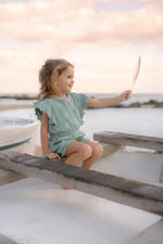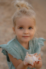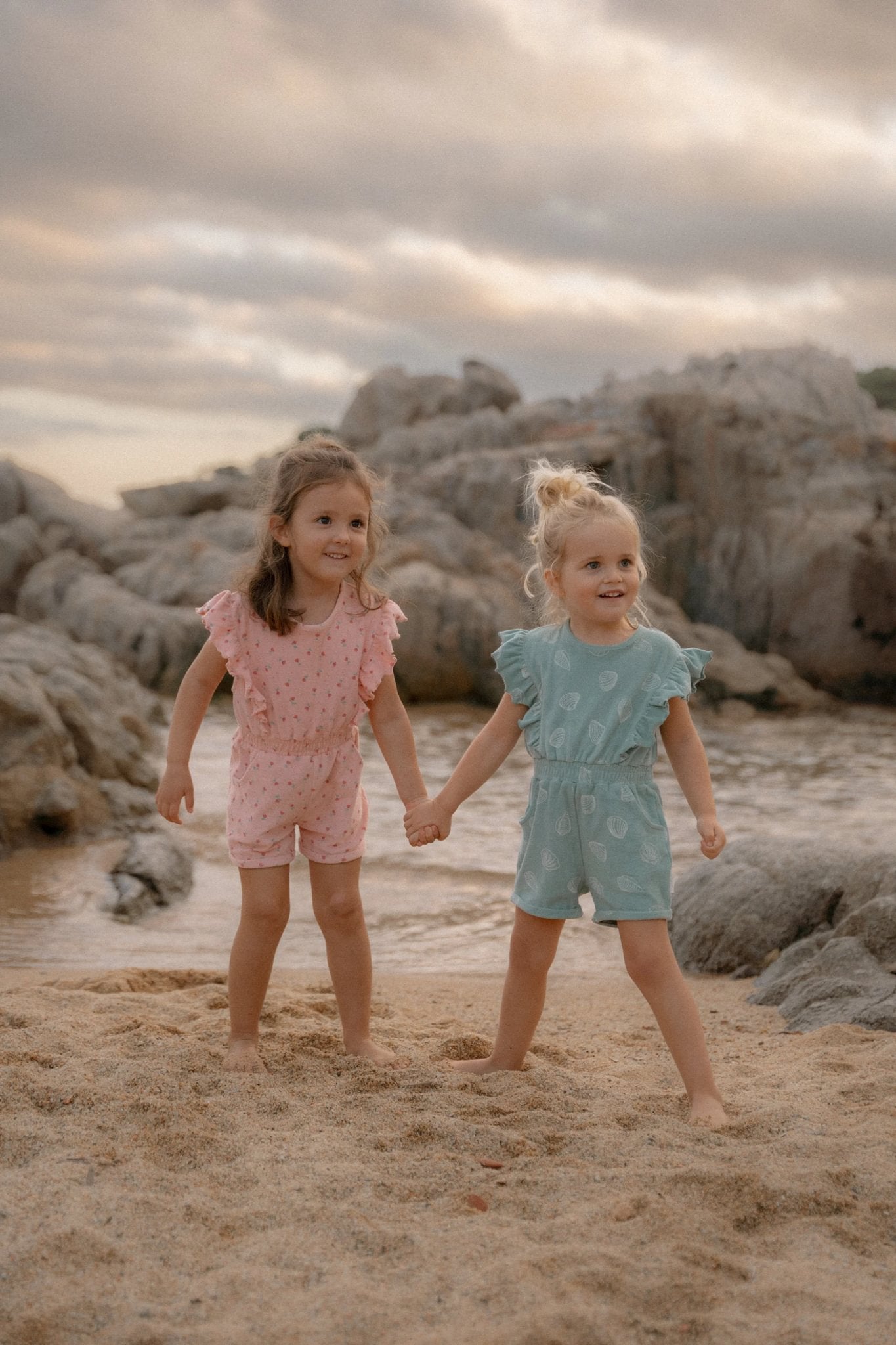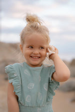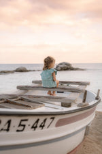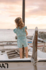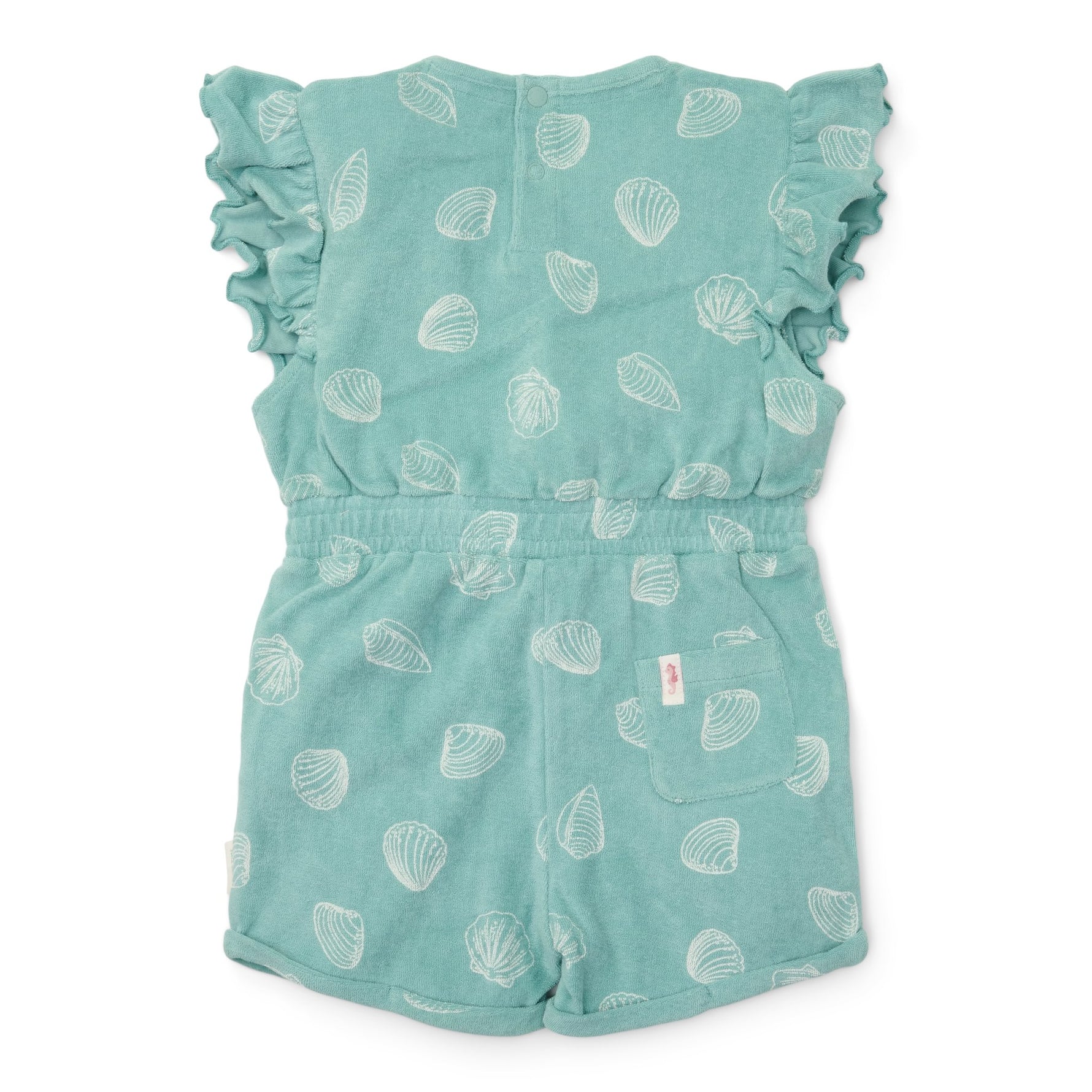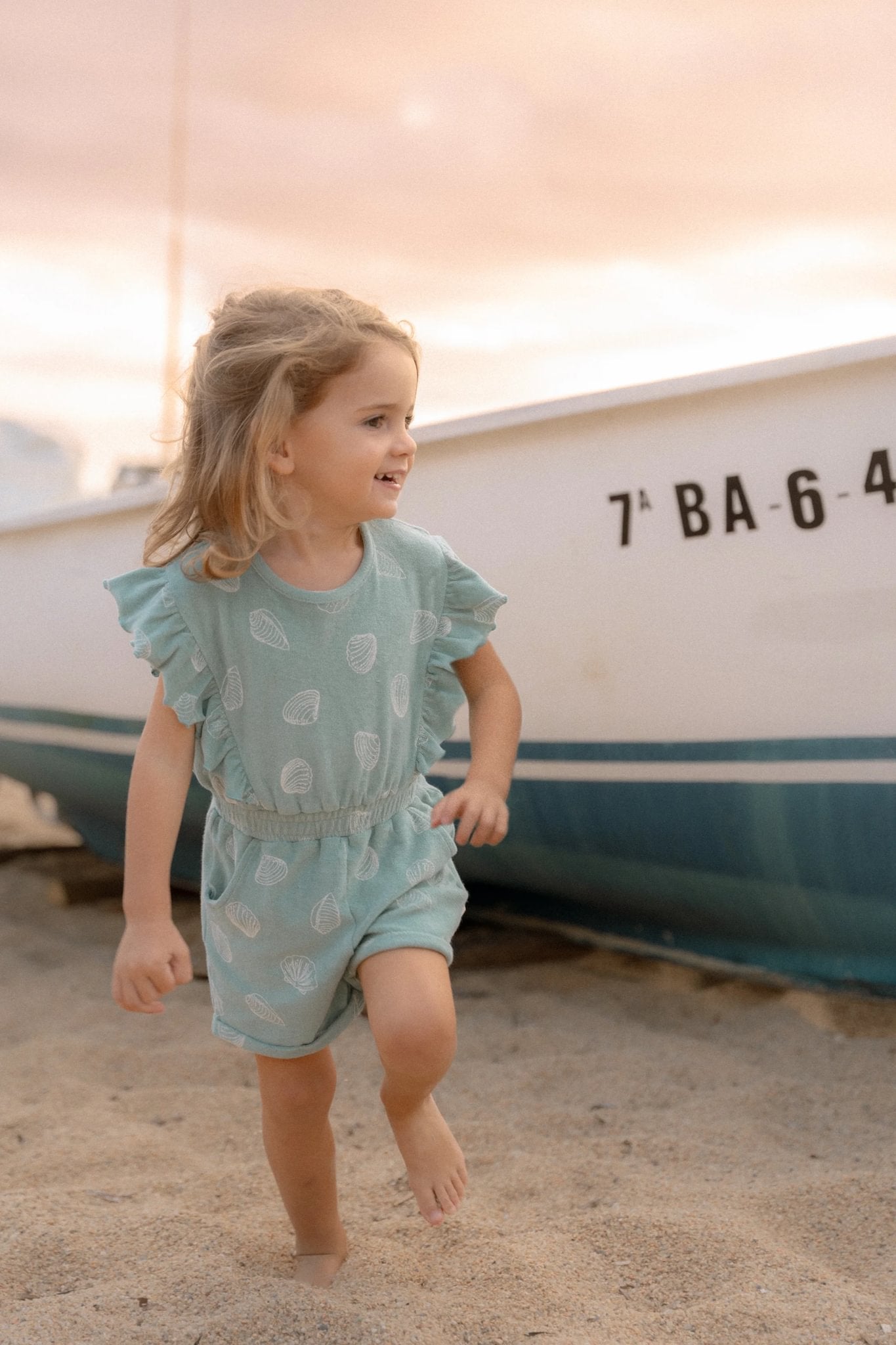 Discover the Ocean Treasures playsuit for kids in the colour Surf Blue. Perfect for after swimming or on a summer day, this playsuit is made of 100% organic cotton in soft terry towelling for ultimate comfort. The cheerful floral themed design adds a playful touch. The ruffles along the body add a charming touch, making this suit a favourite for any summer activity.