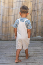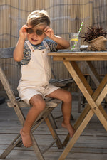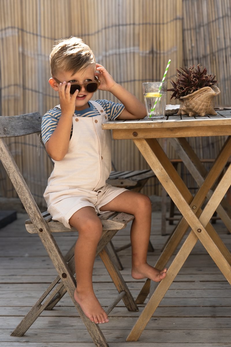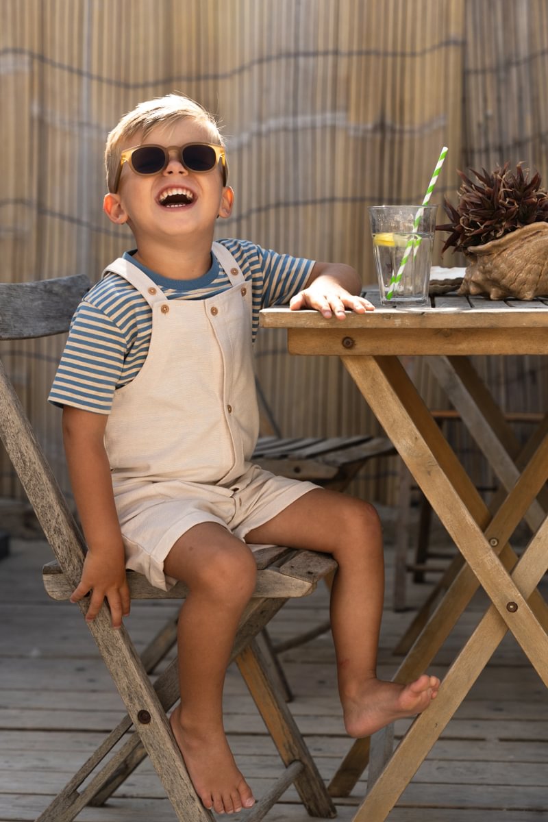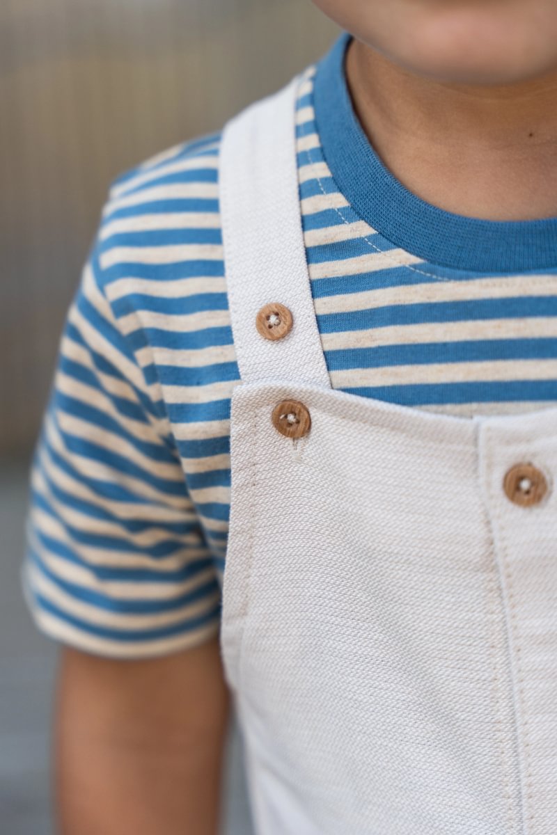 A fresh stripe and a rugged detail make this T-shirt an everyday favourite. The mix of indigo and sand creates a calm, summery look that matches everything. The contrasting chest pocket stands out and adds a playful touch. Made of organic cotton and Oeko-Tex certified. Soft, breathable and great to move in. A lovely tee for boys who love to head out, explore and just be themselves.