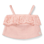 This airy muslin singlet is perfect for outdoor play on warm spring and summer days! The singlet is made of lovely soft organic cotton that is very comfortable for your child's skin. Along the neckline of the singlet are broderie ruffles. Combine the singlet with the matching wide Flower Pink trousers. All items from the Little Farm collection can be combined with each other so you can let your child put together its own outfit. Available in sizes: 74, 80, 86, 92, 98 and 104.