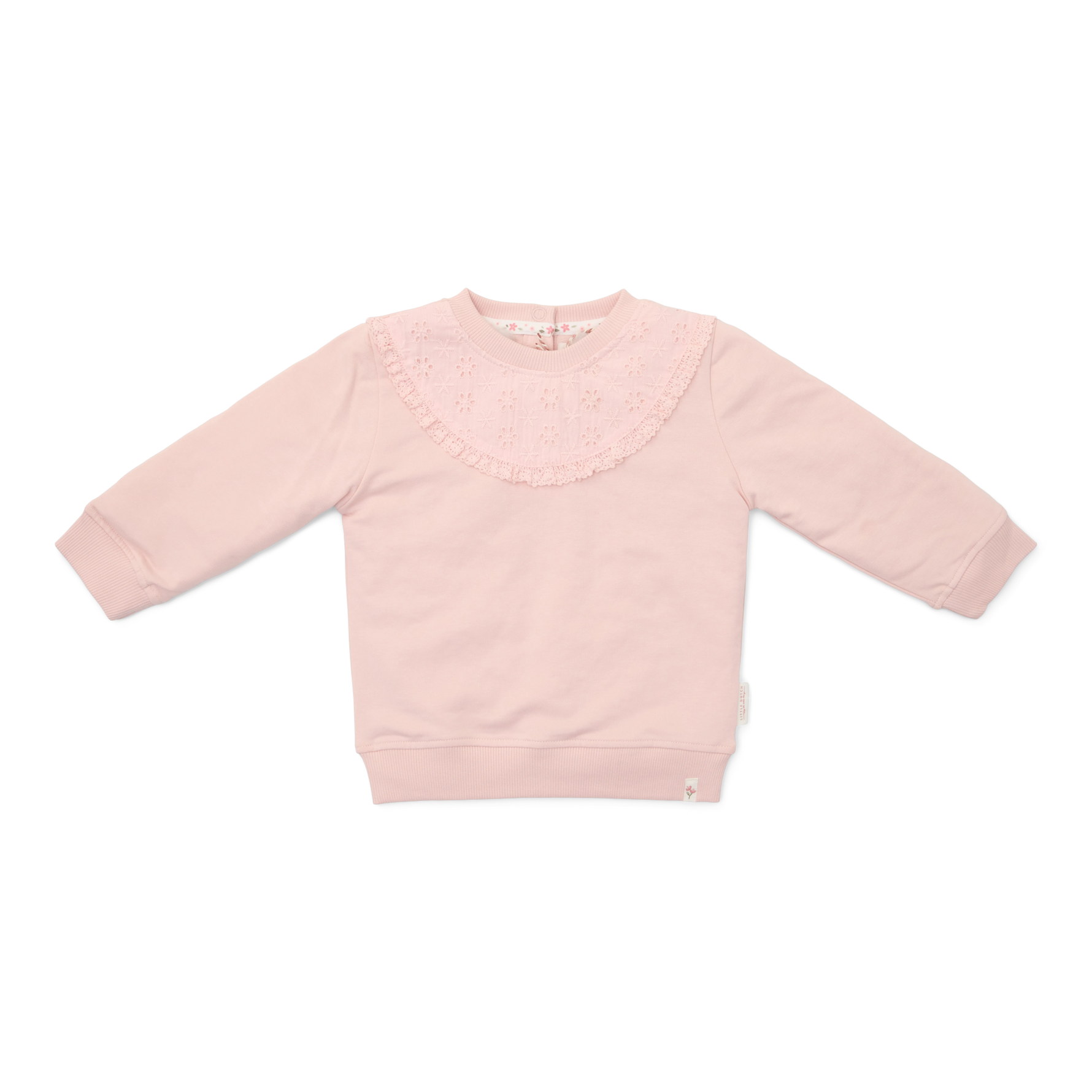 Ready to embark on a magical adventure amidst the beauty of Lotus blooms?! This sweater in a lovely shade of pink will take you there in style! Perfect for layering on cooler days or wearing alone during milder weather, this sweater is a versatile and stylish option for any occasion. The delicate broderie lace detailing along the neckline adds a touch of elegance, while the ruffle trim enhances its feminine charm. Made from organic cotton, this sweater adds colour and sweetness to your little one's outfit.