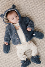 So soft and cuddly! This is the beary cute teddy cardigan for those cosy moments. As warm as it is comfortable, it has a Stone Blue teddy fabric with sweet ears on the hood. The soft organic cotton lining has a playful all-over Little Goose print, and the teddy fabric is perfect for during the colder days. Wooden buttons give it a classic and natural accent. This cuddly cardigan is available in sizes 50/56, 62, 68 and 74. Mix & Match with the NOOS Forest Friends collection.
