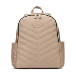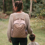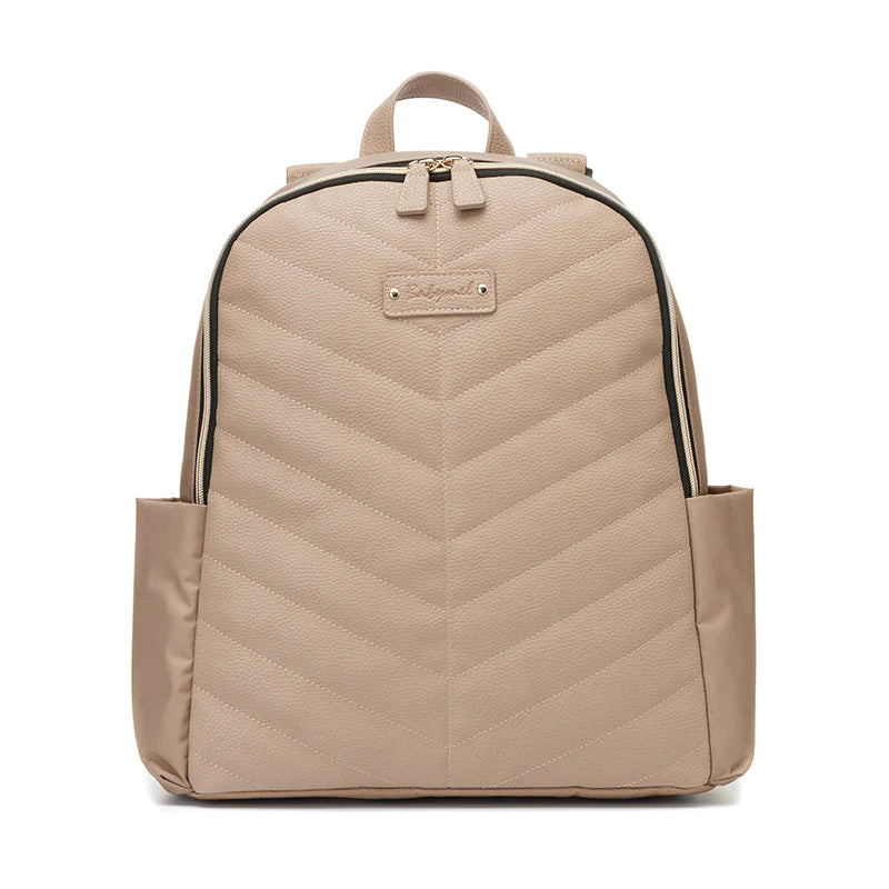 Parent in style with your Gabby backpack. Spacious, durable, and most of all - stylish. The vegan leather front panel features a chevron quilt stitch detail to give this changing bag a contemporary look. With a wide and secure double zipped closure for worry free days out with your family.