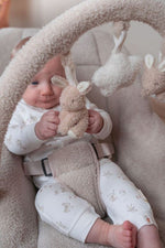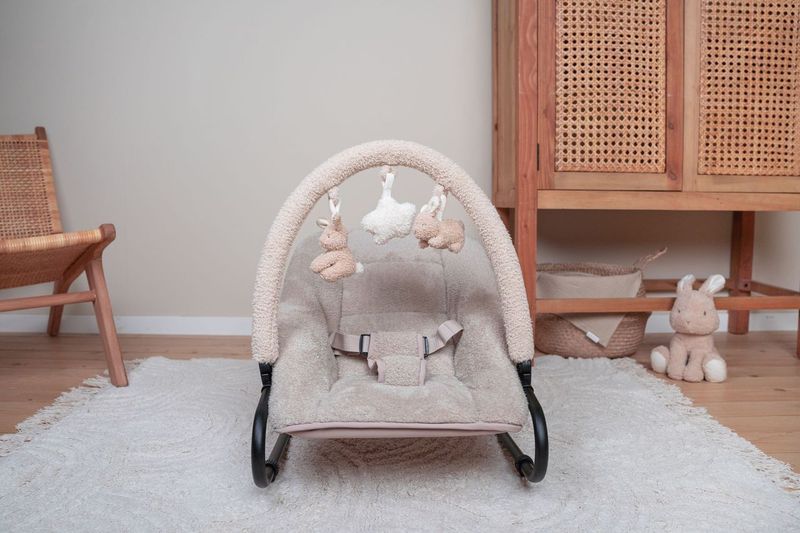 The bouncing chair offers your child a comfortable place to relax and play. Your child sits securely in the 3-point safety harness and can play for hours with the toys on the play bar. Thanks to the rocking frame, the bouncing chair starts wobbling as if by a small movement of your child. Both the backrest and footrest are adjustable. The chair comes with a reducer cushion and an adjustable play arch. Attached to the play arch are a jumping bunny, a cloud and a sitting bunny. The backrest is adjustable to various positions and the seat can be used in both a rocking position and a fixed position. The bouncing chair is suitable for your child from birth to 6 months (around 9 kg), your child can lie comfortably in the seat.