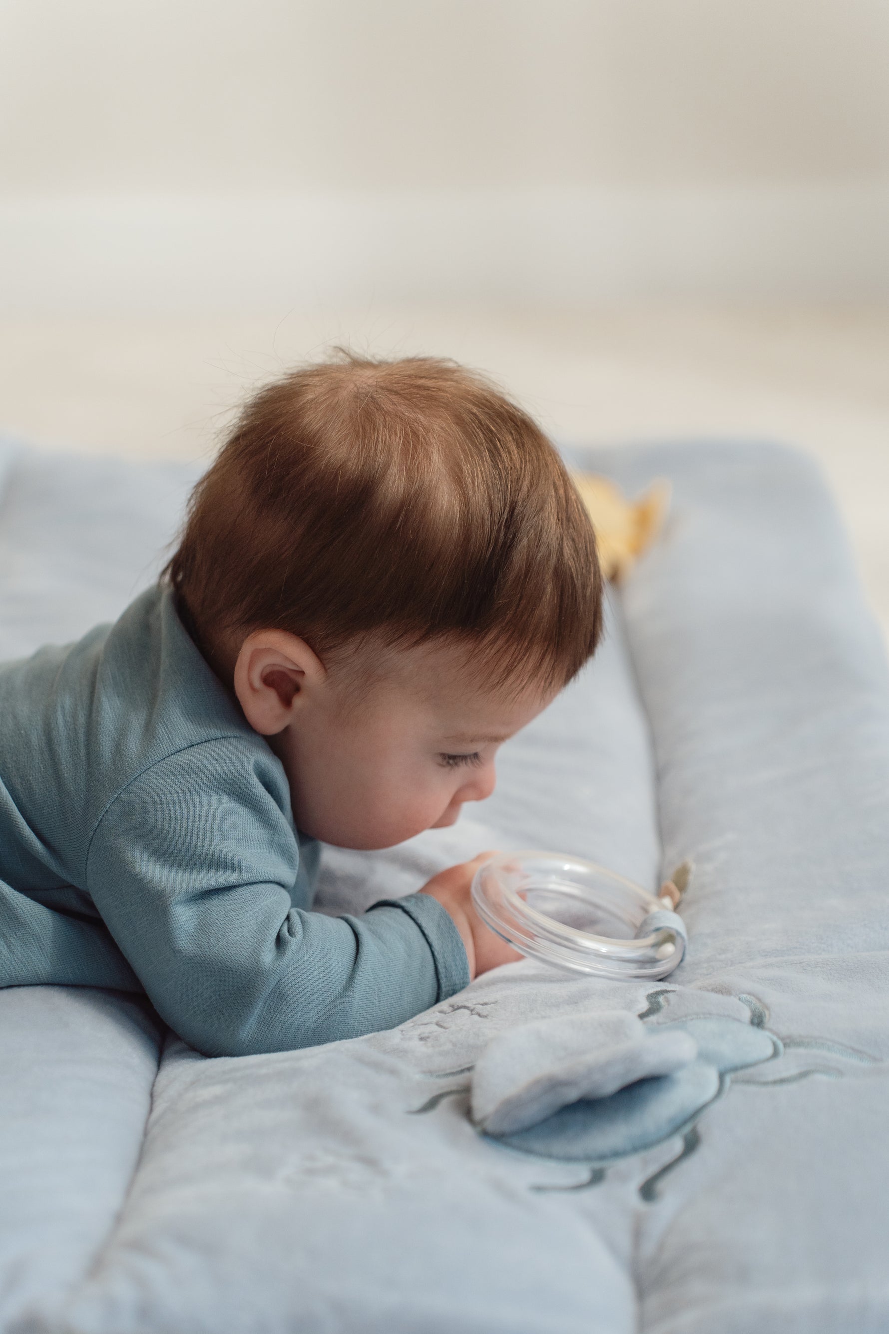 This padded playpen rug with Miffy on it stimulates your child's senses through the different textures and activities. There is so much to discover and see! The four-leaf clover makes a sizzling sound, behind the sun hides a mirror, the beetles are made of a wonderfully soft fabric and there are various labels to discover. There is also a ring grammar attached to the playpen rug. And don't forget Miffy with her Lucky Leaves outfit.