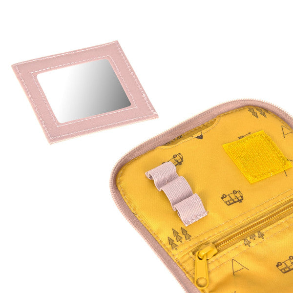 Soap, shower gel, skincare products and a hair brush can all be stowed in the well-organized main compartment. Toothbrush, toothpaste and accessories like hair clips can be placed in two inside mesh pockets and in the separate zipped pocket. The water-repellent material, the hook for hanging the bag up and the removable mirror included in the set, make it particularly useful. A small, clear name badge sleeve prevents any mix-ups.