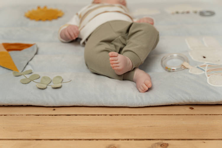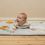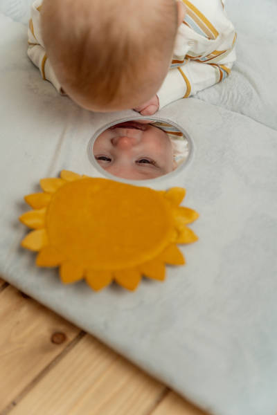 This quilted playpen mat with miffy on it stimulates your child's senses with the different textures and activities. There is so much to explore and see! The kite makes a crackling sound, a little mirror is concealed behind the sun, the clouds consist of lovely soft teddy fabric and there are various labels to discover. A teething ring has also been attached to the playpen mat. And don't forget miffy with her striped outfit and rattling ring with beads!