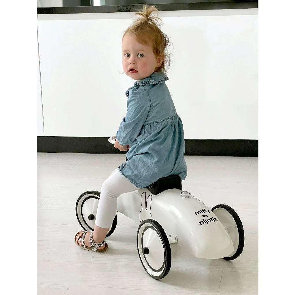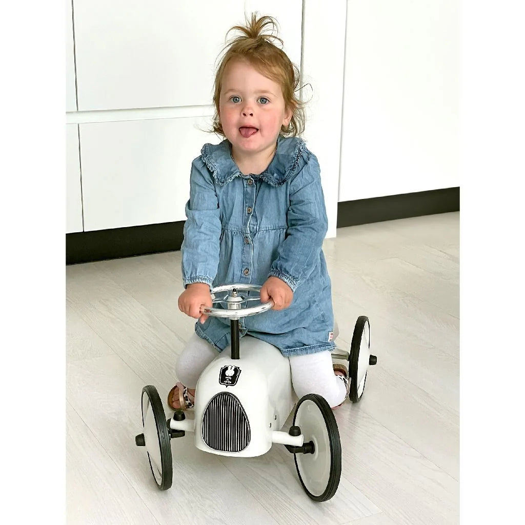 Start your engine and race towards a new adventure! With this cool retro roller you will make a big entrance. This retro roller is a vintage walker that helps your little one make his or her first steps. Inspired by the Formula 1 from the fifties, this olive coloured retro roller will look great in any room, as decoration in the nursery or in your living room. The metal ride-on car comes equipped with metal wheels and rubber tyres and a plastic seat. The height of the saddle is 28 centimetres, measured from the floor to the top of the saddle