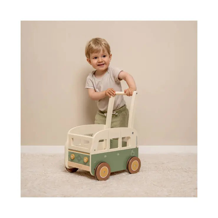 Ready for a pretend road trip? This wooden vintage wagon, inspired by a classic surfer van, is the perfect play companion. Your child can load it up with cuddly toys, blocks or other treasures and push it around during playtime. Ideal for storing and transporting toys in a playful way. With its retro look and fun details, this wagon adds a stylish touch to any room. And with rubber strips on the wheels, your floors stay safe no matter how exciting the ride gets.sing through the room.