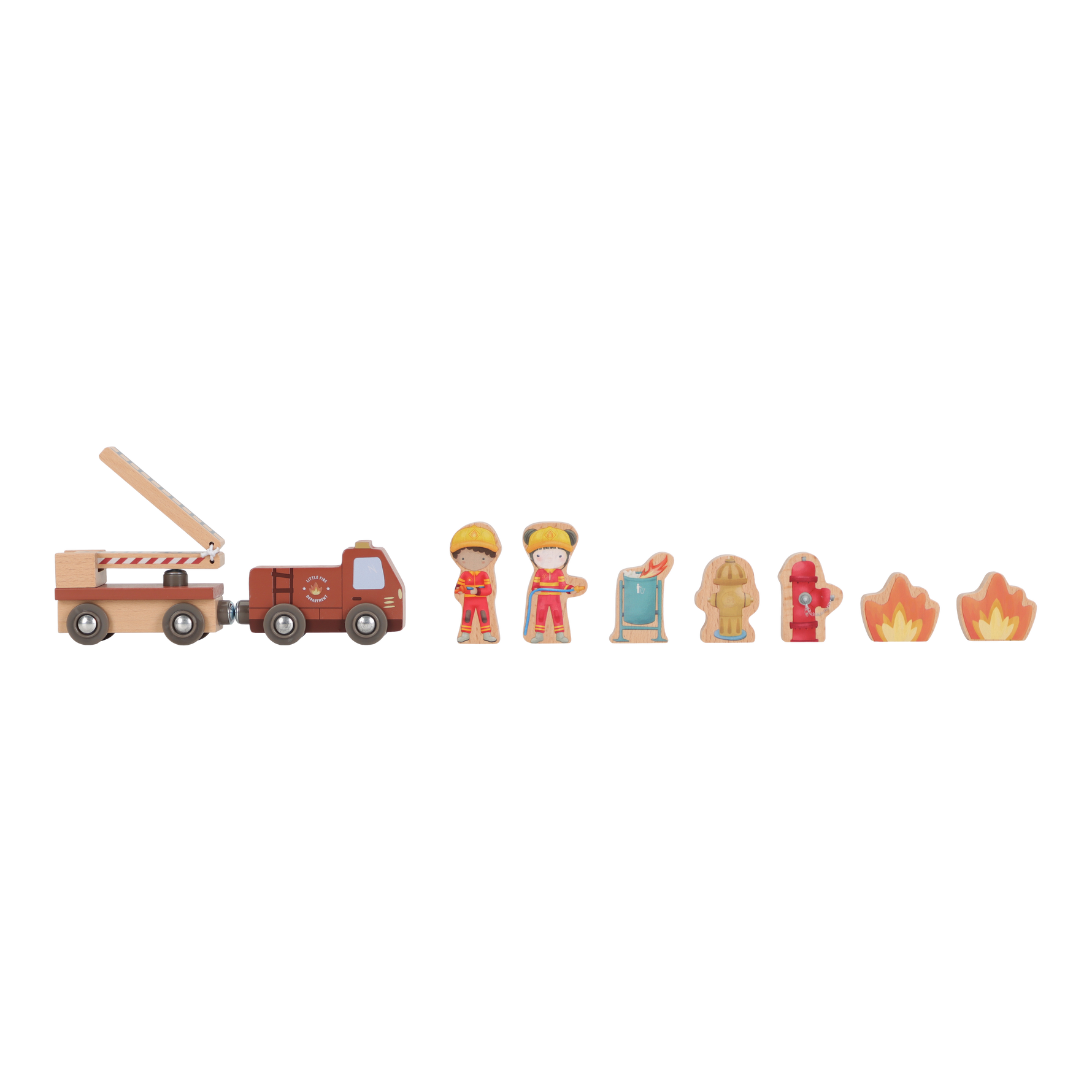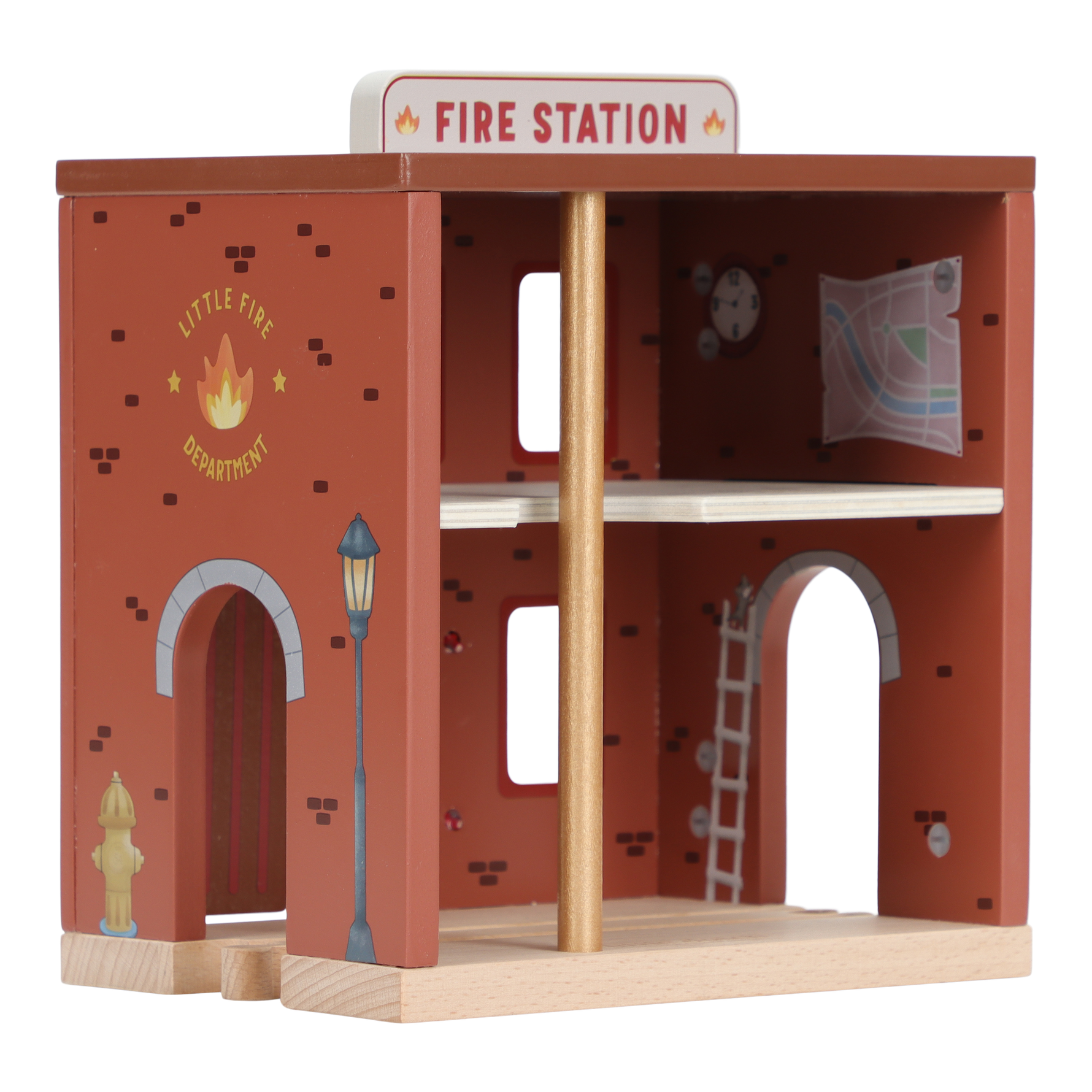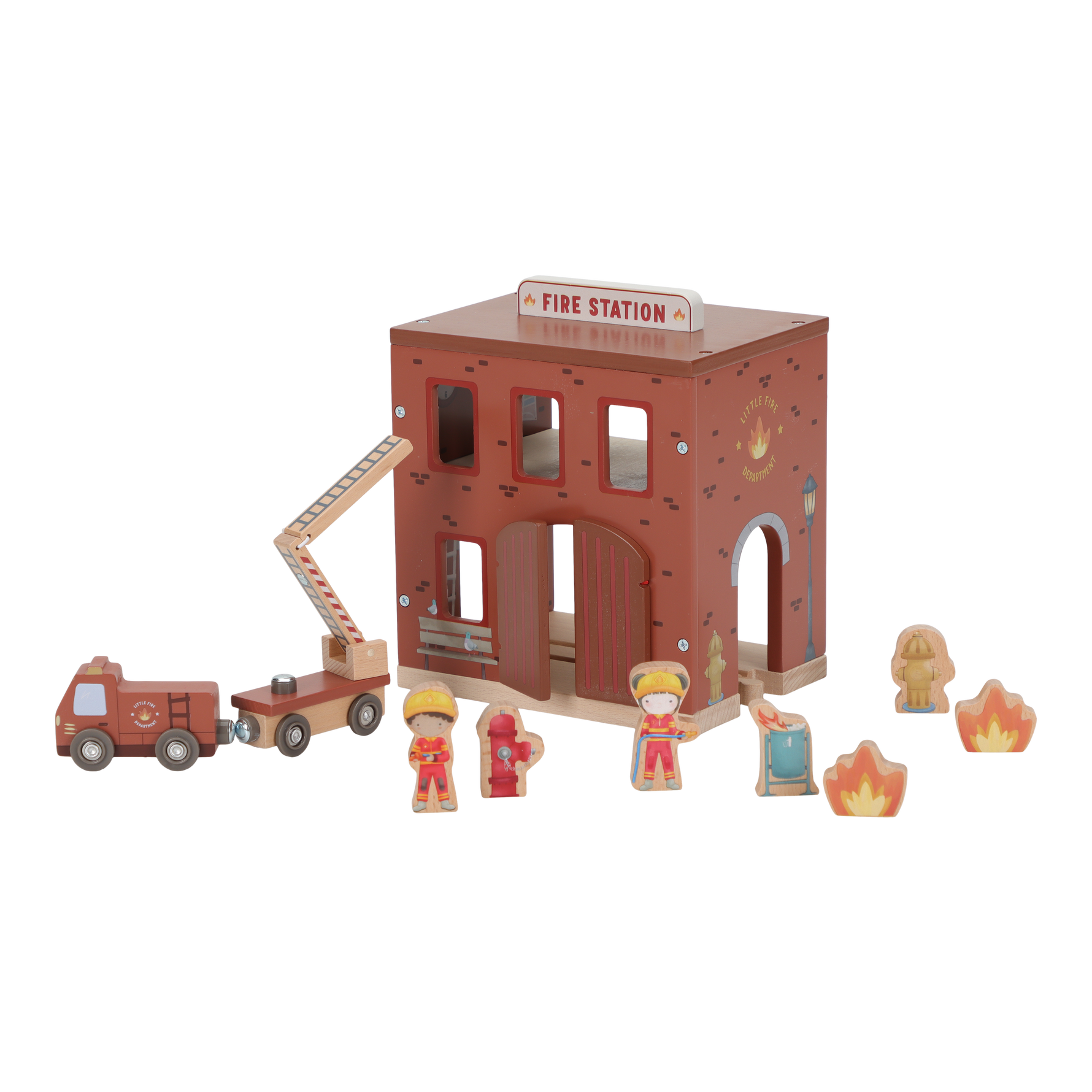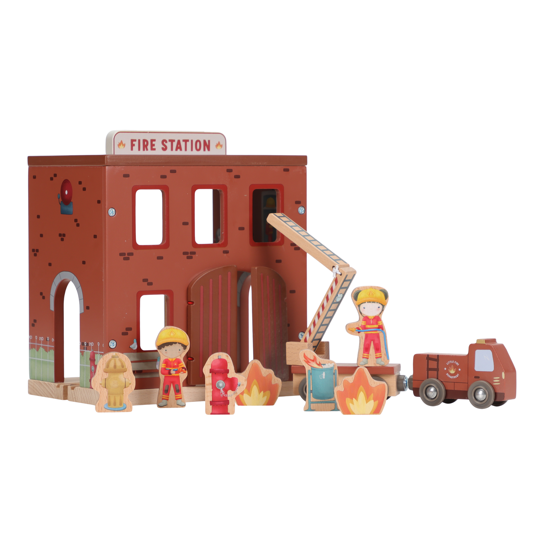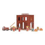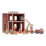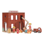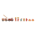 The alarm goes off! This wooden fire station has everything you need for an exciting rescue operation. Open the doors, slide down through the fire pole and jump into the fire truck. Including firefighters, flames and a burning trash can. The doors of the barracks can open so you can get out quickly. Combine this set with the wooden train track XL for even more adventure. Who are you said today?