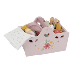 This 31-piece wooden picnic play set will spark your little one’s imagination to turn any moment into a wonderful picnic. The wooden picnic basket is filled with delicious food, 2 sets of cups, plates, and cutlery, and of course, a blanket to set the stage for role-playing. The fruit in this set can be divided by the wooden knife and put back together with Velcro. There are sandwiches, a croissant, and a baguette that can be topped with the included slices of cheese, tomato, and lettuce for a real picnic experience. The cap of the jam  and the lid of the orange juice bottle can be opened and closed, and there’s even a treat for little sweet tooths.