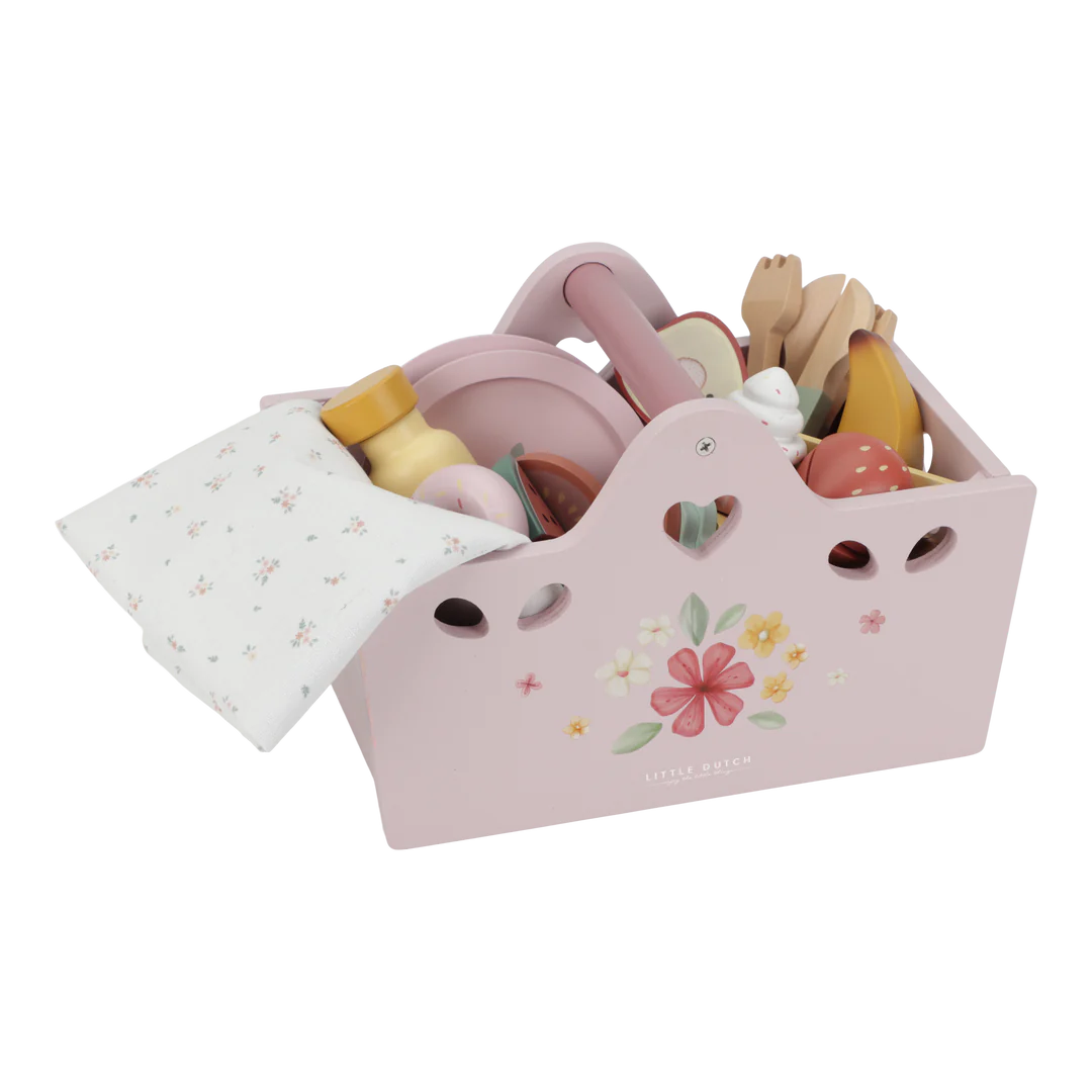 Watch your little one explore the fun of picnicking, create delicious meals, and develop creativity through role-play with this wooden picnic play set.