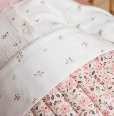 Keep your baby snug and warm during sleep with this beautiful bassinet blanket. It is crafted from 100% organic cotton and adorned with subtle quilted stripes, offering a contemporary look. Plus, it's lightly padded for added coziness, making it an ideal choice for your little one’s room. This reversible blanket offers two prints from the Fairy Garden collection. You can opt for the subtle style of Fairy Blossom with an off-white base scattered with little flowers, or choose the pink canvas of Fairy Floral.