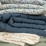 Keep your baby snug and warm during sleep with this beautiful bassinet blanket. It is crafted from 100% organic cotton and adorned with subtle quilted stripes, offering a contemporary look. Plus, it's lightly padded for added coziness, making it an ideal choice for your little one’s room. This reversible blanket offers two prints from the Forest Friends collection. You can opt for the subtle style of Forest Treasures with an off-white base scattered with little mushrooms and leaves, or choose the light blue canvas of Forest Adventure.