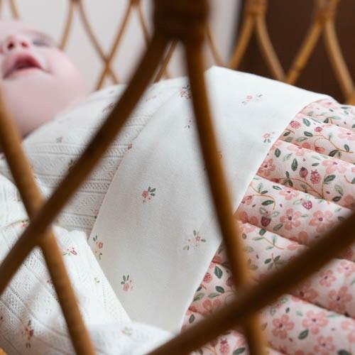 Keep your little one snug and warm during sleep with this beautiful cot blanket. It is crafted from 100% organic cotton and adorned with subtle quilted stripes, offering a contemporary look. Plus, it's lightly padded for added coziness, making it an ideal choice for your little one’s room. This reversible blanket offers two prints from the Fairy Garden collection. You can opt for the subtle style of Fairy Blossom with an off-white base scattered with little flowers, or choose the pink canvas of Fairy Floral.