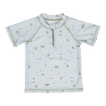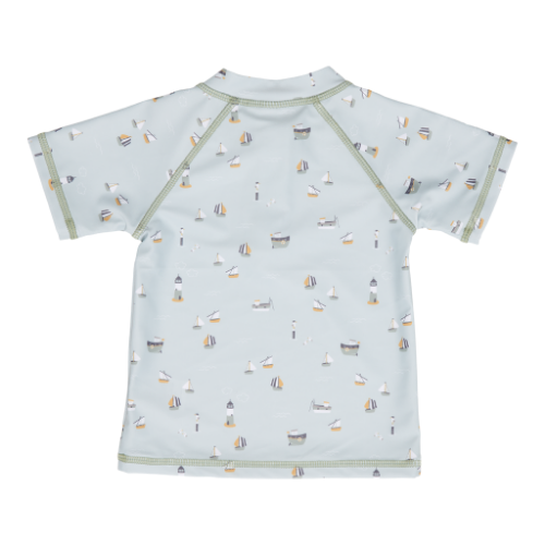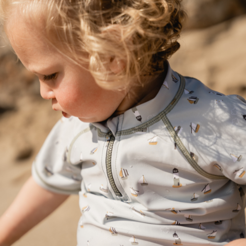 Are you ready for a day of water fun? This short-sleeved rash guard of recycled polyester will keep you warm in the water and protects you from the sun while you play all day long. Whether you love to surf the water or float around in a swim ring, this rash guard is the perfect choice for summer activities at the seashore. Light blue and covered in the seagulls, lighthouses and sailboats of Sailors Bay, this short sleeved rash guard gives your little surfer a cool nautical look as well as a comfortable fit. The zipper helps to slip in and out of the t-shirt, even when wet. The rask guard is made from UV protective fabric and is available in sizes 62/68, 74/80, 86/92 and 98/104. Pair with the matching swim short and turn it into a two-piece swimsuit. Bring a towel and a swim ring and you have all the essentials for a day at the beach or pool. Don’t forget to always use sunscreen lotions to protect your little one.