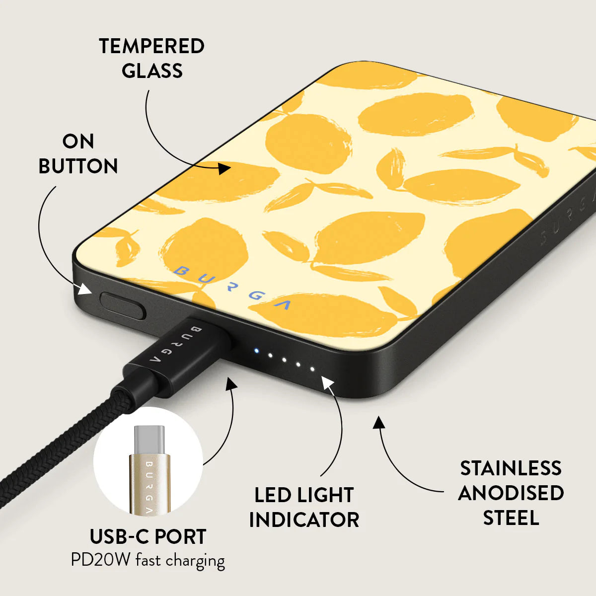 Charge your devices on the go with BURGA’s Magnetic Power Bank.