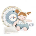 Flore is made of organic cotton stuffed with 100% recycled polyester fibres. She wears a swaddle t-shirt with green plant motifs, as well as plain green bloomers. His Doudou attached to the hand is in cotton velvet on the front, and in linen on the back.