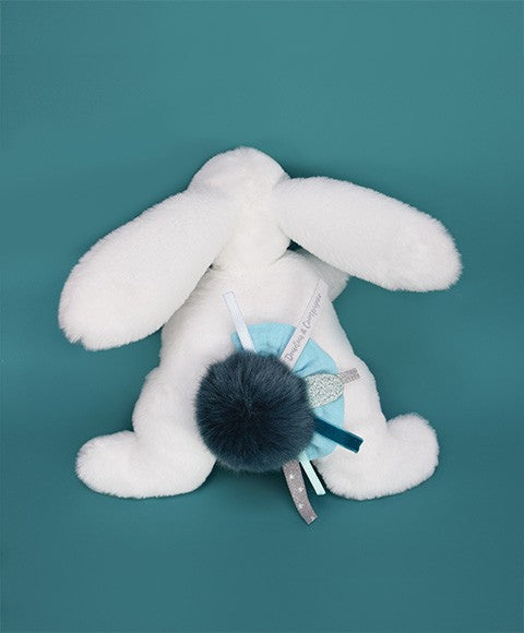Stylish, "mix and match" trend, with its peacock blue pompom, trimmed with touches of aqua-coloured swaddle, as well as fancy trimmings and skilfully coordinated woven ribbons, this happy rabbit sparkles with audacity, Nestled in a superb gift box with graphics evoking both modernity and luxury, like a magical setting, this surprise cuddly toy is delicately revealed...
