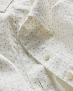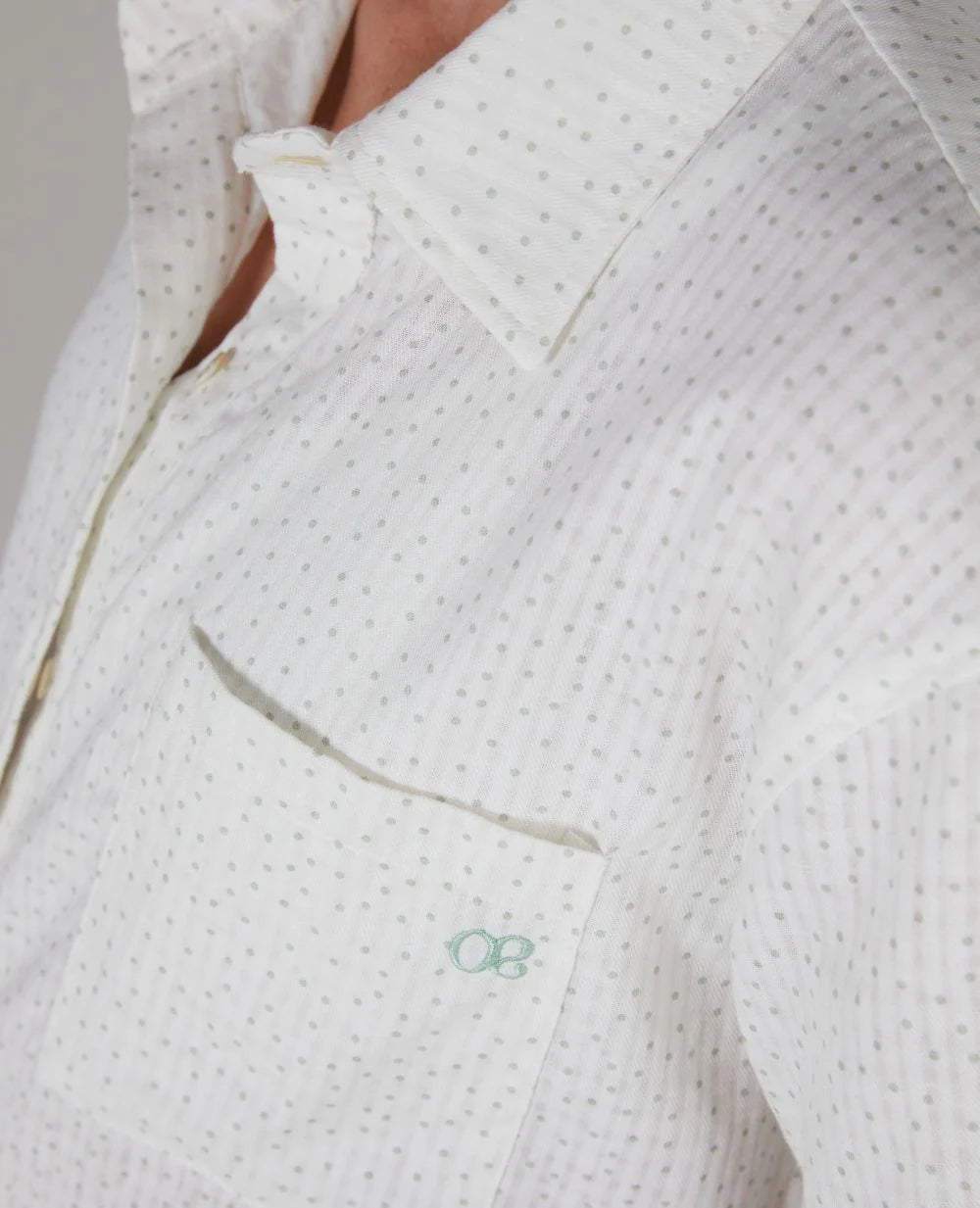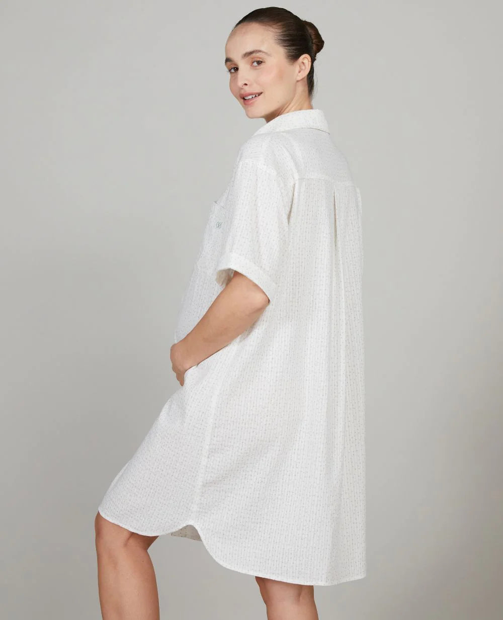 With its white pattern with small green polka dots on the nightdress, Paulette has small details that make all the difference: a pocket at chest level with green embroidery, short rolled up sleeves and pretty natural pearl buttons.