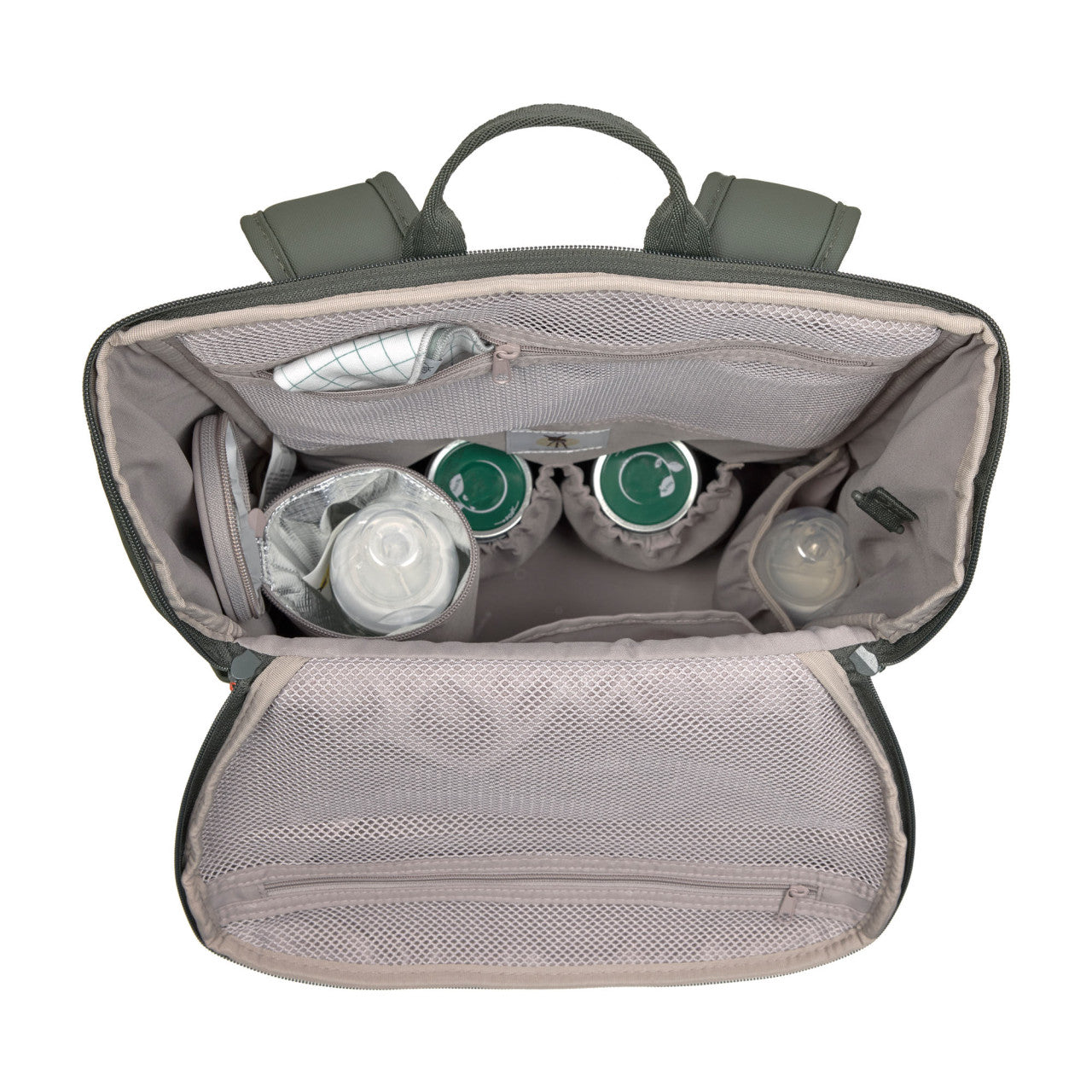 The LÄSSIG Slender Up Backpack changing bag in olive is made from 100% polyester (recycled) and impresses with its clever storage space. The generous opening and practical changing accessories make it the ideal companion for families.