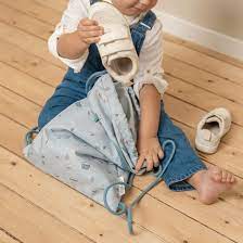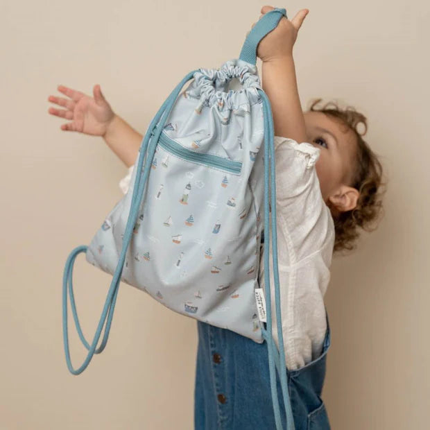 This cute gym bag with Sailors Bay Blue print is made from recycled PET bottles. The pocket with zipper on the front of the bag can also be used as extra storage. The bag has a handle and double drawstrings allowing your child to wear it as a backpack.  The gym bag measures 38 x 29 cm. You can write your contact details on the label on the inside of the bag.