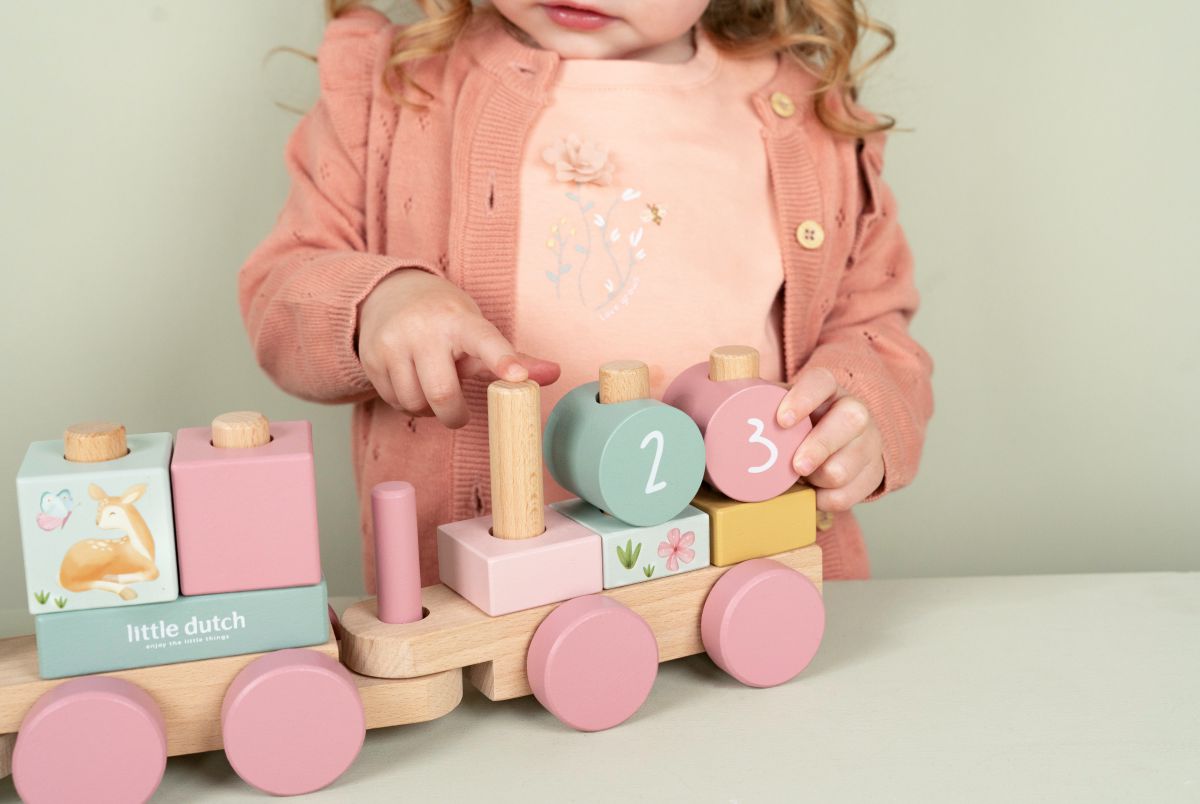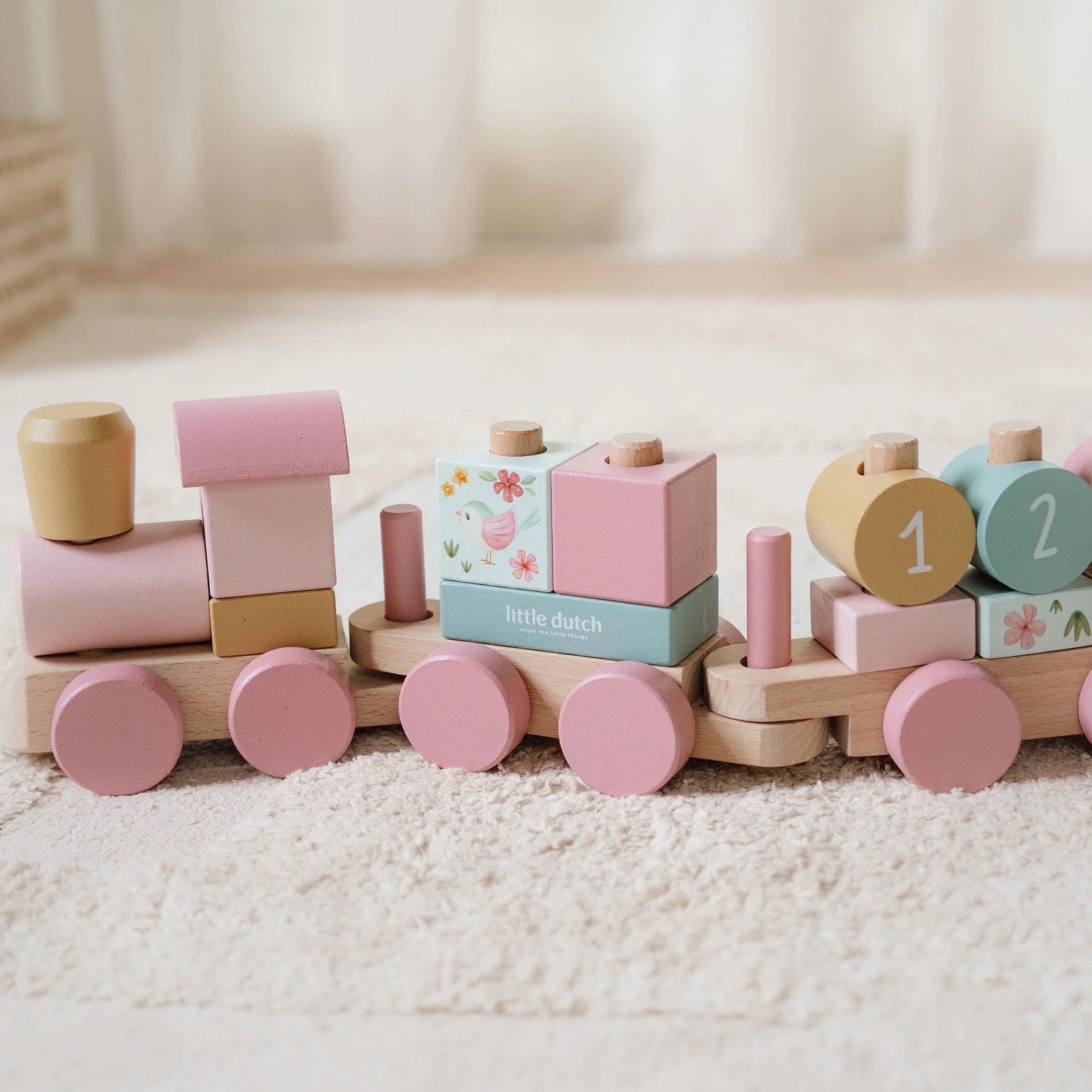 Choo choo! All aboard for a magical journey through the enchanting Fairy Garden! Let's stack these blocks one by one and create the three wagons of this beautiful wooden train. With colourful flowers, friendly birds, and the numbers 1, 2, and 3 adorning some of the blocks, this stacking train will transport you to a land of imagination and wonder. A fun way to play and develop hand-eye coordination at the same time. The train includes 17 parts and is approximately 45 cm long.