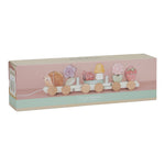 Choo choo! Gather all the lovely animals, flowers and treasures from Fairy Garden and hop on board for a magical journey. Stack all the blocks one by one to the three wagons of this wooden stacking train. The hedgehog will take the lead and sits at the front. Which flower will follow and where does the lady bug sit? Each block becomes a piece of the story of your imagination. A fun way to play and develop hand-eye coordination at the same time. The train includes 15 parts and is approximately 45 cm long.