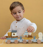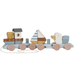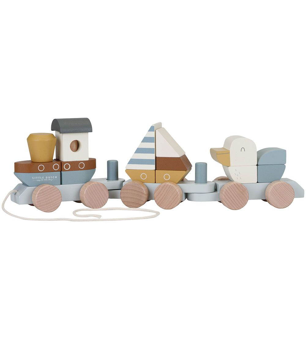 The Little Dutch stacking train consists of a train and two carriages with small sticks. To the train come sixteen blocks in different shapes and colours, which can be assembled into a lokomotiv, a sailboat and a duck. The Blocks have a hole in the middle so they can be stacked on the piles. The train has small wheels and a long cord so the kid can pull it after him.