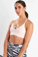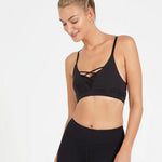A lace up detail bra fit for yoga! Featuring a v neck mesh line detail with strappy detail front and back, perfect for showing under your layering pieces.