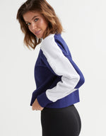 ALYNA sweat top in blue depth + bright white is the ultimate throw-over. Made with 100% cotton fabric + a relaxed, slim fit for high-level comfort and a flattering look. Ft. a cropped body length, finishing just above the high and contrast shoulder + sleeve panels in bright white along with subtle micro dot print on the lower sleeve. Pair with ALYNA trackpant for the complete look.