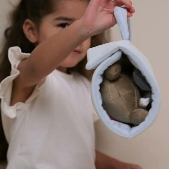 This doll sleepover playset will encourage lots of hours of play pretend. The soft light blue suitcase folds open into a bed and carries the loveliest sleeping accessories to mimic the bedtime ritual. Your little one can put Rosa in her pajamas, prepare for bedtime with the tooth brush and tooth paste, snuggle with Little Goose and read a bedtime story from the included book with animal illustrations. When it’s time to go to sleep, your little one can put on Rosa’s sleeping mask and cover her with the teddy blanket. Night night Rosa.,