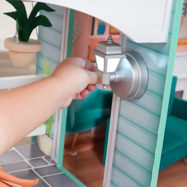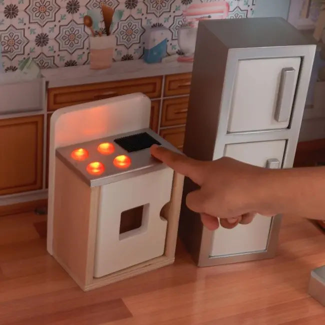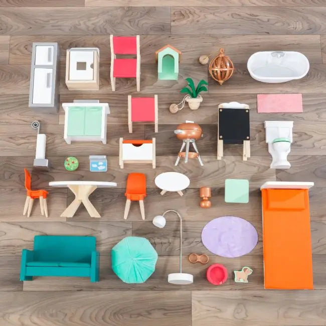 • Expansive 30-piece accessory set with lights and sounds including a staircase, full kitchen and dining set, bedroom set and more