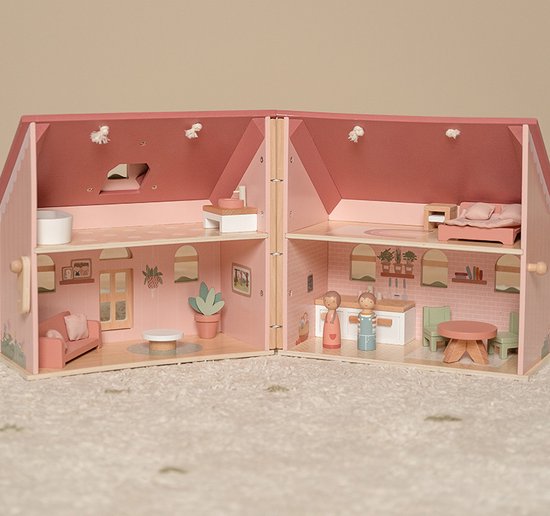 The wooden portable dollhouse from Little Dutch is a cute and cozy pink house with beautiful details. The house has a living room and kitchen downstairs, and a bedroom and bathroom upstairs. With the wooden closure, the dollhouse opens and closes easily, and thanks to the handle, it is easy to take anywhere. The furnishings are included, but there are also additional expansion sets available to further decorate the house. This dollhouse is perfect for children who love to play and imagine with their own little world. WARNING: Not suitable for children under 3 years due to small parts. Choking hazard.