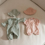 What will your baby doll wear today? This delightful ensemble is perfect for any occasion. Enjoy dressing up your favourite doll for a day filled with playtime adventure. The set features a precious short-sleeved one-piece suit in the Pink Floral design, adorned with lovely little flowers. To complete this charming ensemble, the set includes an cute pink sun hat.
