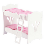 The KidKraft Lil’ Doll Bunk Bed is twice the imaginative fun, with scalloped trim and filigree cutouts for a classic, vintage feel. With two sets of butterfly-print bedding and a ladder to reach the top bunk, this bunk bed will make bedtime fun for a pair of 18-inch dolls.