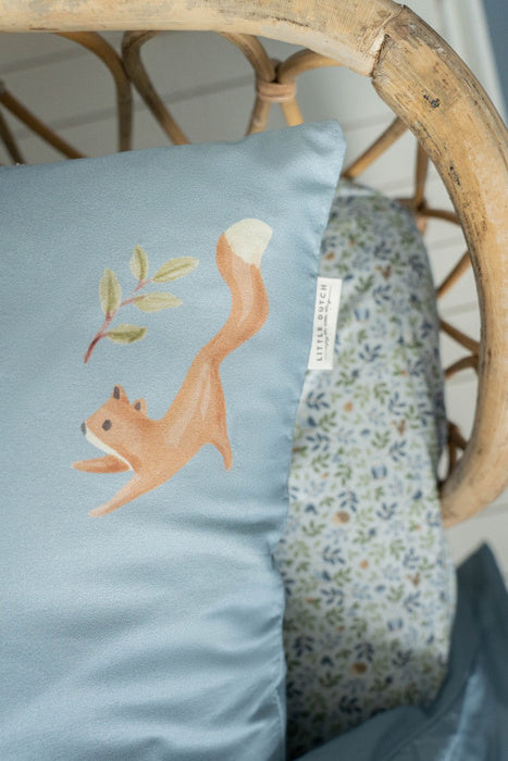 Add a touch of design to the nursery with a beautifully made bed. With this duvet cover for a cot, your little one will dream away to adventure. The Forest Friends collection inspires the most beautiful dreams about an adventurous forest in which a bird, hedgehog and beetle balance on a mushroom. The soft duvet cover is made of 100% organic in a plain Denim Blue color decorated with a playful scene from the forest. Both the pillowcase and the duvet cover are comfortable, beautifully finished and have good breathability. The size of the duvet cover is 110 x 140 cm and the pillowcase is 40 x 60 cm.