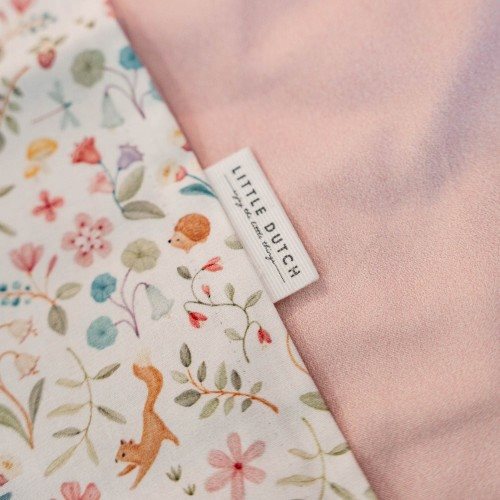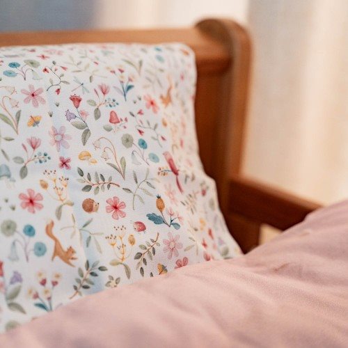 Add a touch of design to the nursery with a beautifully made bed. With this bassinet duvet cover your little one will doze off to the most adventurous dreams. The Fairy Wonders design will inspire adventures in an garden with flowers and cute animals such as squirrels, hedgehogs and birds. The soft duvet cover is made from 100% organic cotton with the Fairy Wonders design on one side and a solid Blossom colour on the other side. The duvet cover is comfortable, beautifully finished and breathable, and has a size of 80 x 80 cm.