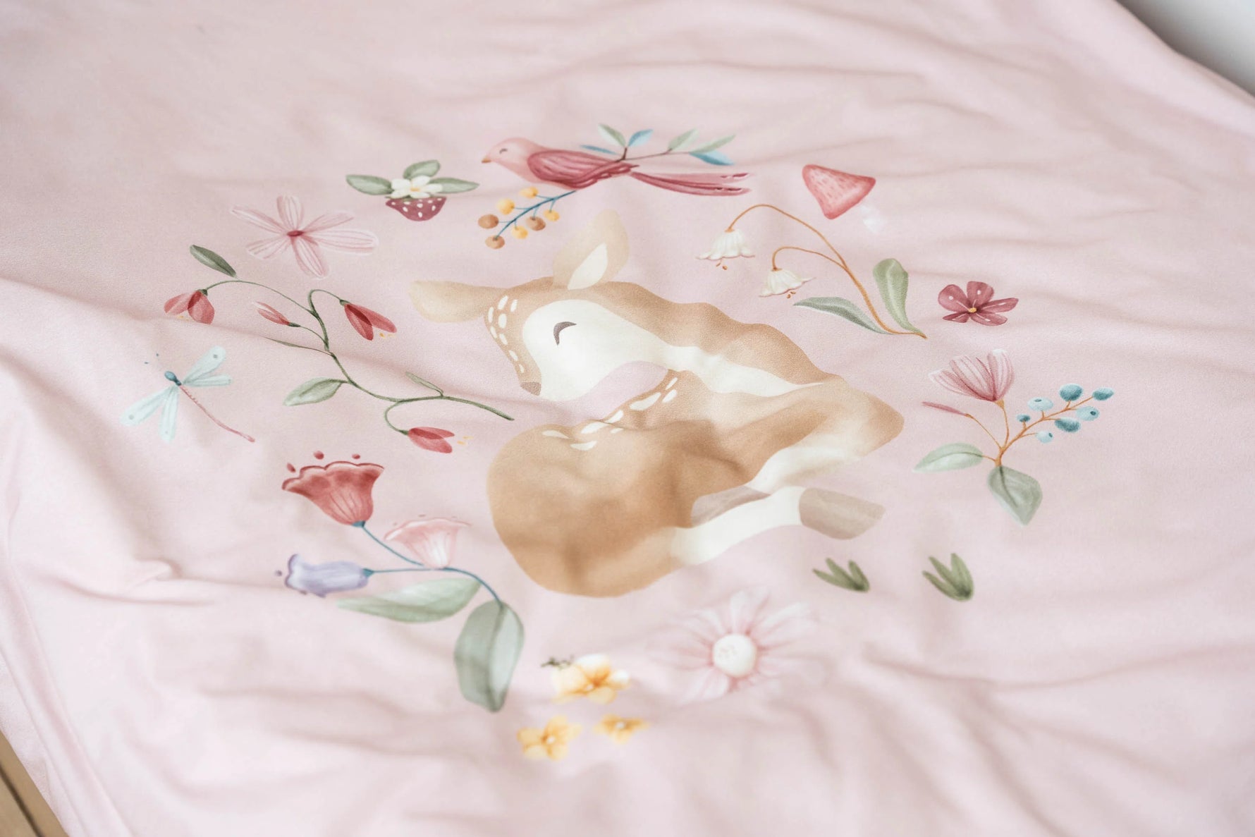Add a touch of design to the children's room with a beautifully made bed. With this duvet cover for a crib, your little one will dream away to adventure. The Fairy Garden collection inspires the most beautiful dreams about a garden where the most beautiful flowers grow, the birds sing and a sweet deer shows the way. The soft duvet cover is made of 100% organic cotton in a solid Blossom color decorated with a playful scene of a colorful garden. Both the pillowcase and the duvet cover are comfortable, nicely finished and have good breathability. The size of the duvet cover is 120 x 150 cm and the pillowcase is 40 x 60 cm.