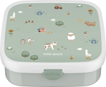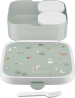 Choose variety with the extra-large lunchbox with Little Farm print, from the Little Dutch collection. Includes removable bento tray and fork. The possibilities for a great children's lunch are endless. Bring along fresh bread and fruit? Or a savoury snack for school? Chunks of cheese, sausage, nuts or dried fruit? Choose, mix and keep it nice and separate. Thanks to the two separate compartments, the bento always keeps everything in the lunchbox deliciously fresh. Prefer just sandwiches? Take out the bento tray and you have plenty of room! Of course, both the lunchbox and the bento boxes can be easily cleaned in the dishwasher after use.