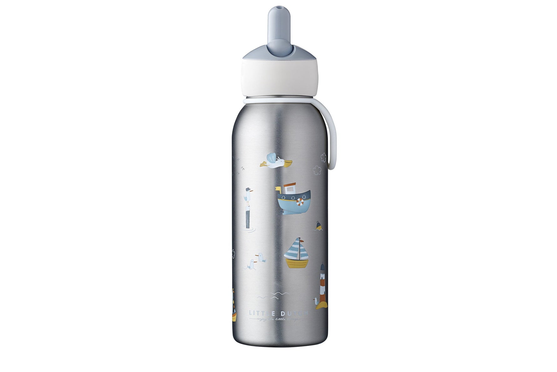 Stay cool on the playground with this insulated flip-up bottle with a Sailors bay motif. The insulated bottle will keep your child's drink refreshingly cool all day long. The bottle has a practical flip-up drinking system, easy for even the smallest children to use. Just flip up the spout to drink! The spout is attached to a straw inside the bottle. It's guaranteed leakproof, so the bottle can be stored safely in a school bag, but it also has a handy loop to make it easy to carry. The insulated bottle is also suitable for carbonated drinks. When used for carbonated drinks we recommend to use the bottle without the straw. The bottle is completely BPA-free and easy to clean. To ensure you can enjoy your stainless steel bottle for a long time, we recommend hand wash only. The cap is dishwasher safe.