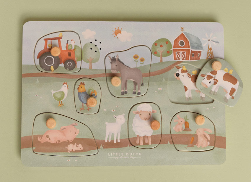 Meet all the animals on the farm and recognize their shapes and unique sounds with this fun puzzle. When you place the animal back in its correct place, you will hear a matching sound. This puzzle with 7 animals and a tractor with sounds promotes hand-eye coordination and stimulates your child's vocabulary. The puzzle contains light-activated sensors - use in bright light for the best results. Make sure the switch is ON to activate the sound function. Sensors can be accidentally activated by direct sunlight, so always turn them off when not in use. (Batteries (2 x AAA) not included.)