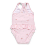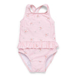 Dive into the joy of the water! Whether it's the rhythmic waves at the beach, the refreshing sea breeze, or the crystal-clear pool waters, this bathing suit will get you there in style. The Rosy Meadows bathing suit is a charming and delightful swimwear piece designed to bring joy to sunny days by the water. The wide straps on the shoulders that cross on the back give your little one comfort and support on a day of water fun. The flowers scattered across the beautiful pink coloured base, add a touch of nature’s beauty to the bathing suit. To enhance the charm, the ruffled skirt creates a playful and adorable silhouette. Available in sizes 62/68, 74/80, 86/92, and 98/104. Even though the UPF-coating on the fabric of the bathing suit gives protection from the sun rays, don’t forget to always use sunscreen lotions to protect your little one. This enchanting swimwear piece is designed to capture the imagination of your little one and make pool or beach days even more memorable.