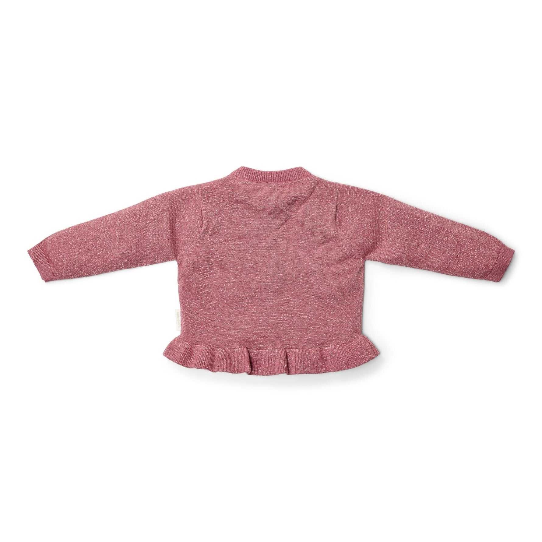 Add a touch of sparkle to your little one's wardrobe with this festive cardigan. This cozy garment is not just any cardigan: it features playful lurex shine, a graceful ruffle at the bottom and a wavy edge along the hem for just that little extra flair. The wood-look buttons give it a natural look, and as icing on the cake is one button in the shape of a flower, because why not? Made of wonderfully soft, organic cotton. Available in sizes 74 to 104.