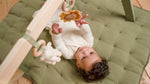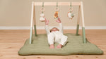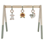 Up with those little arms! Curious babies will have a great time with this wooden baby gym. There are three different activity toys that provide entertainment, including a cheerful sheep, a cute chicken, and a colorful flower. The baby gym develops hand-eye coordination, improves motor skills, and stimulates the senses every time your little one reaches for one of the toys. WARNING! To prevent possible injury by entanglement, remove this toy when the child starts trying to get up on its hands and knees in a crawling position. Adult assembly required.