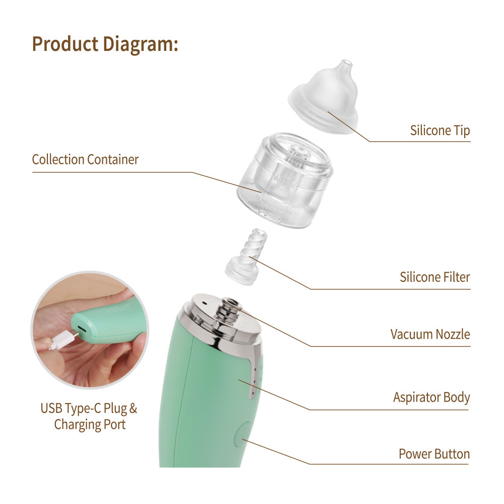 • Three adjustable suction strength levels to gently and effectively clear nasal fluid.