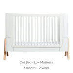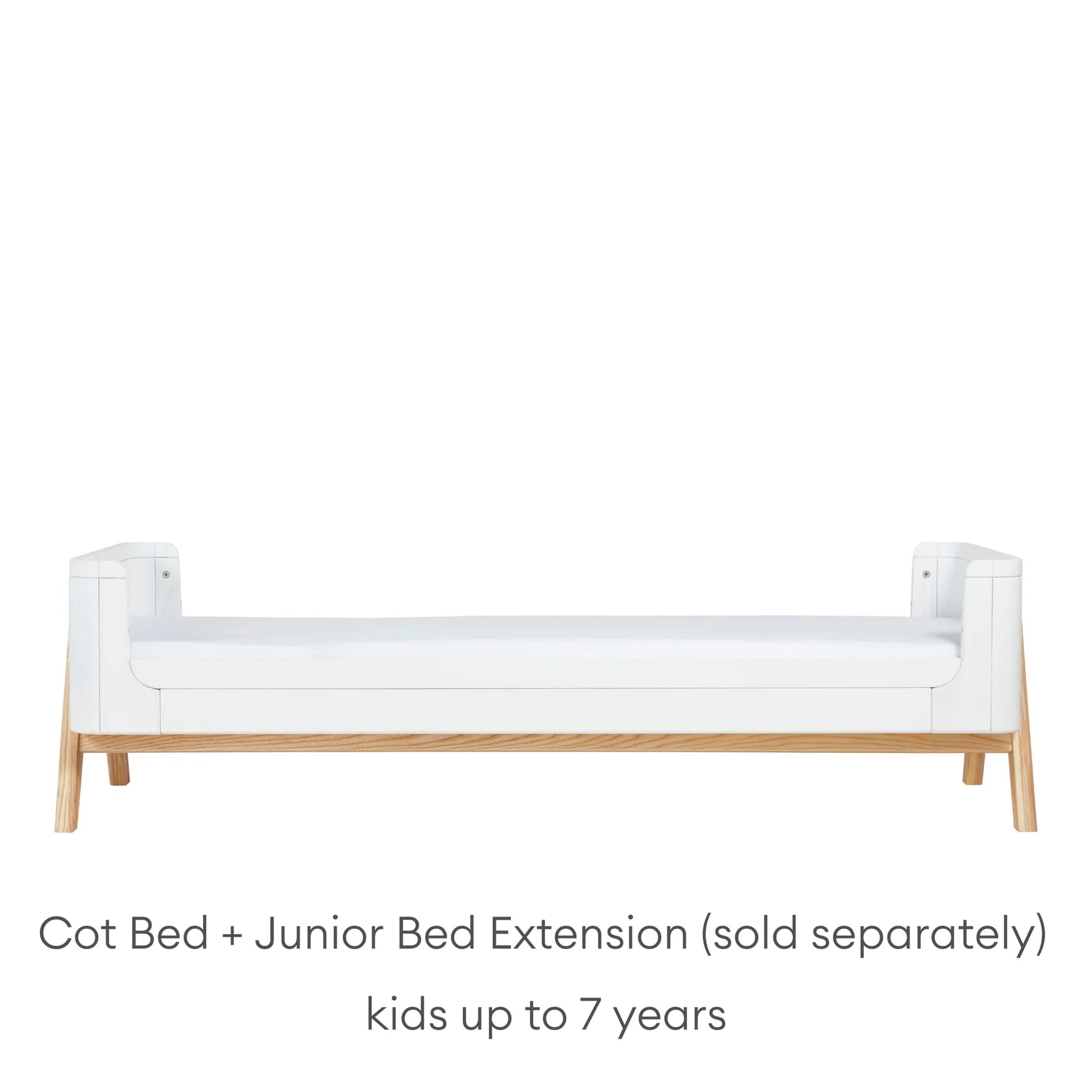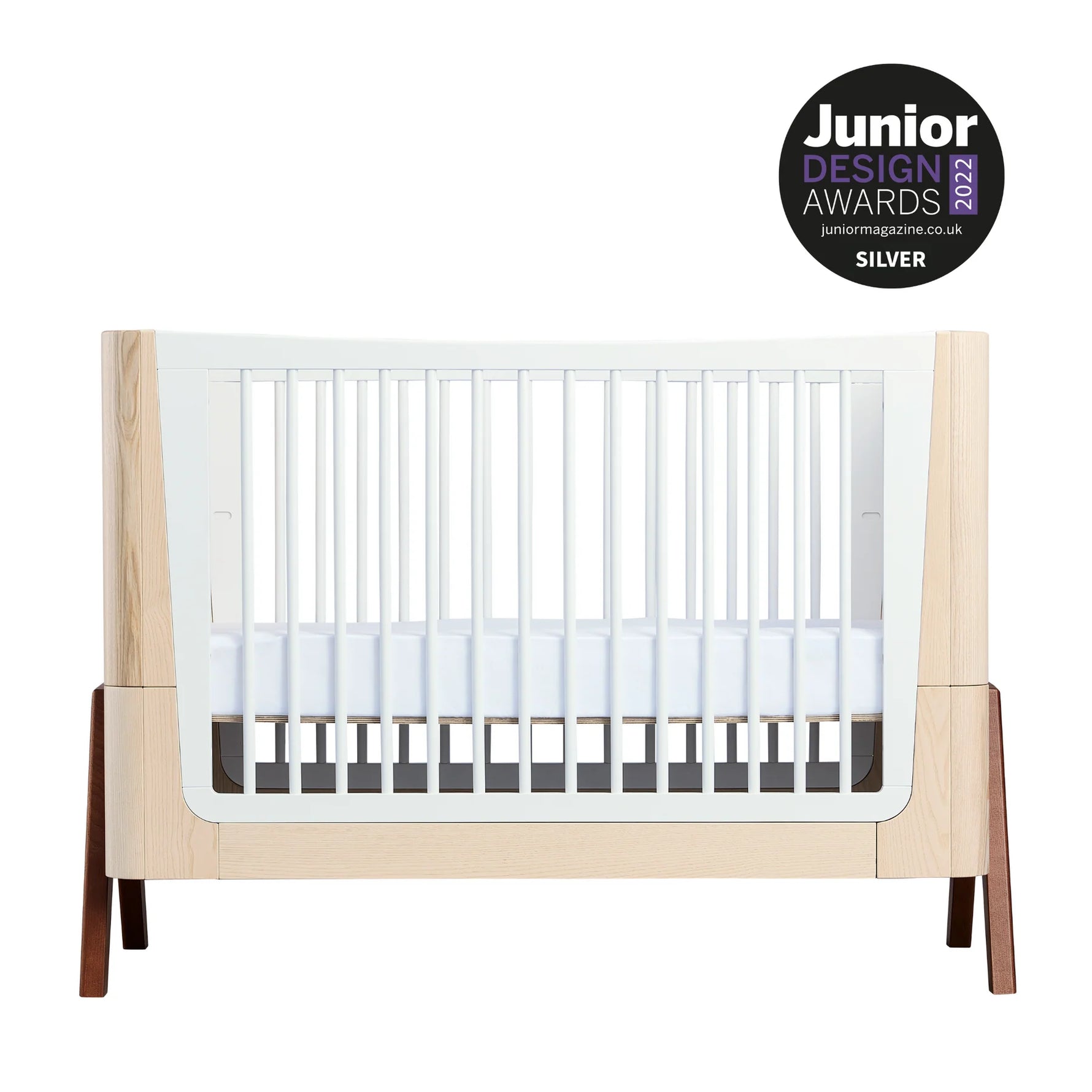 The Hera Cot Bed is a beautiful Mid-Century inspired and cleverly designed choice for your family. Made from 100% real ash wood from sustainably managed ash forests, the gently curved ends in White tones highlight the real grain of this eco-friendly wood with stunning Natural Ash A-frame accents.